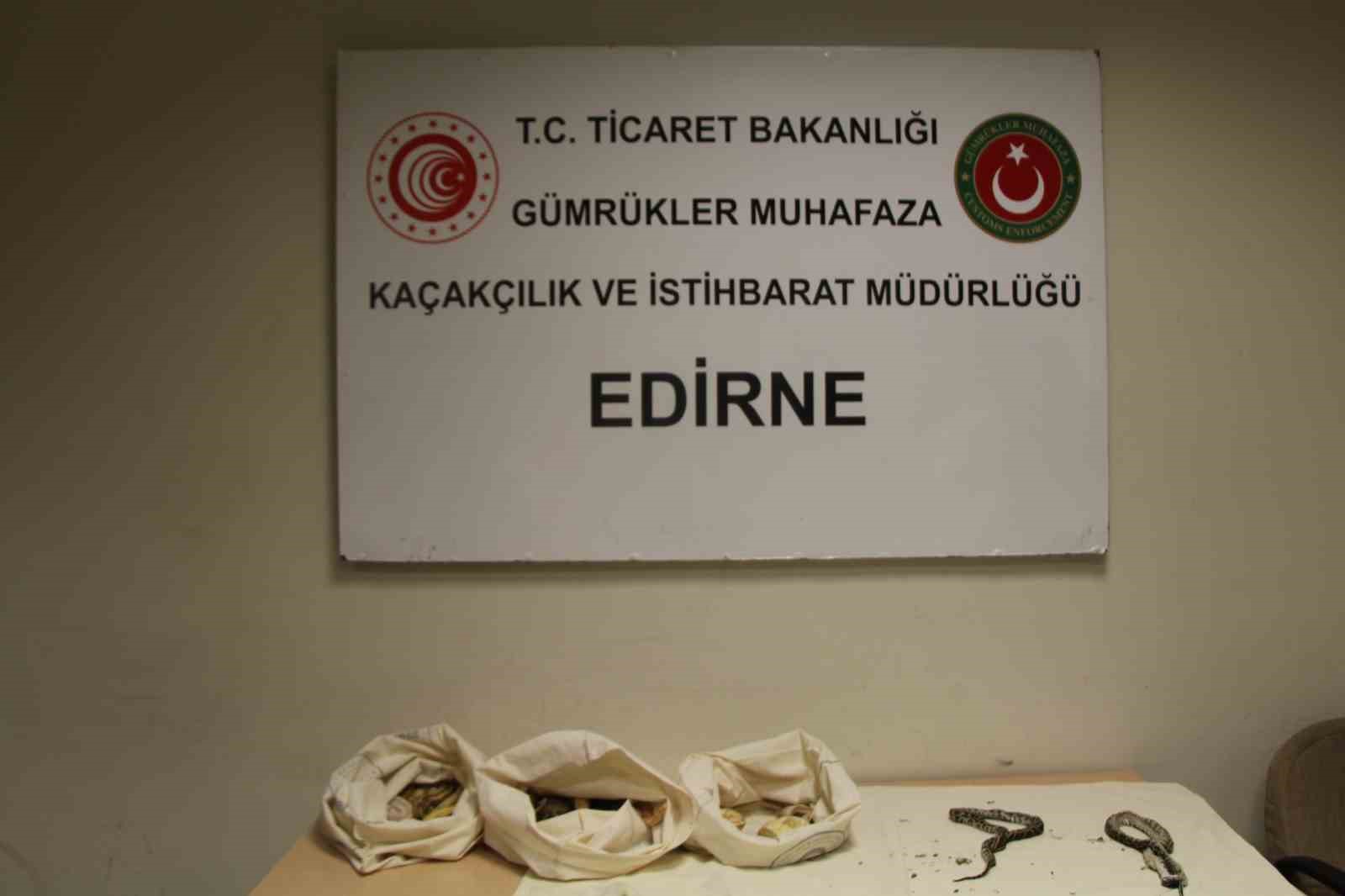 Edirne Kapıkule Gümrük Kapısı’nda yürütülen operasyonda Bulgaristan’dan ülkeye giriş yapan yolcu trende 2’si ölü vaziyette 33 adet piton ele geçirilmesine ilişkin yeni görüntüler ortaya çıktı.