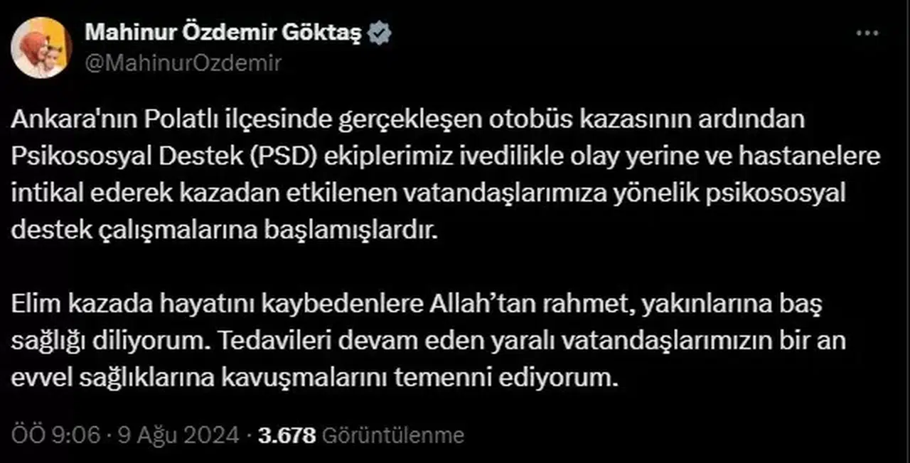 Aile ve Sosyal Hizmetler Bakanı Mahinur Özdemir Göktaş, "Ankara’nın Polatlı ilçesinde gerçekleşen otobüs kazasının ardından Psikososyal Destek (PSD) ekiplerimiz ivedilikle olay yerine ve hastanelere intikal ederek kazadan etkilenen vatandaşlarımıza yönelik psikososyal destek çalışmalarına başlamışlardır" dedi.