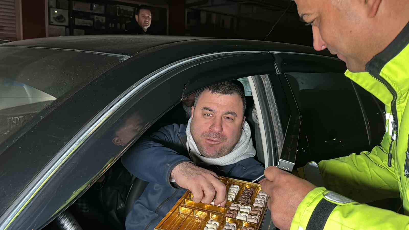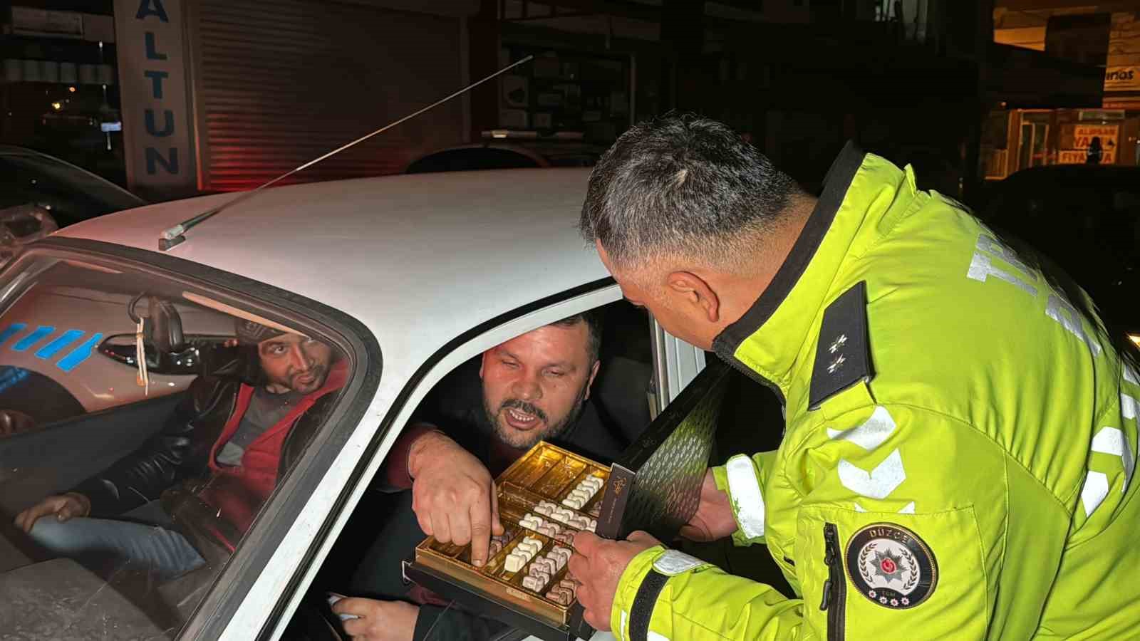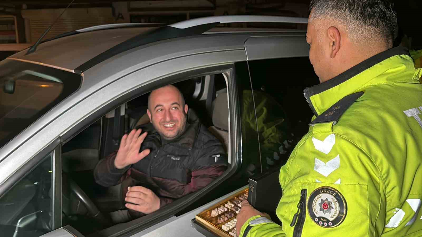 Düzce’de polis ekipleri yılın ilk denetiminde sürücülere bu sefer ceza yerine çikolata dağıttı.