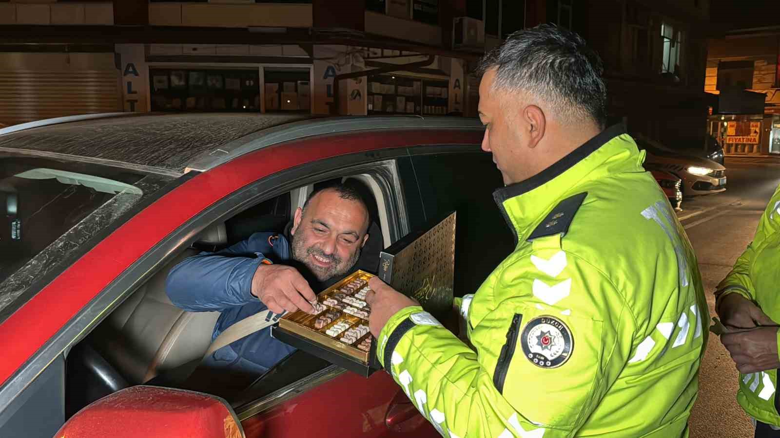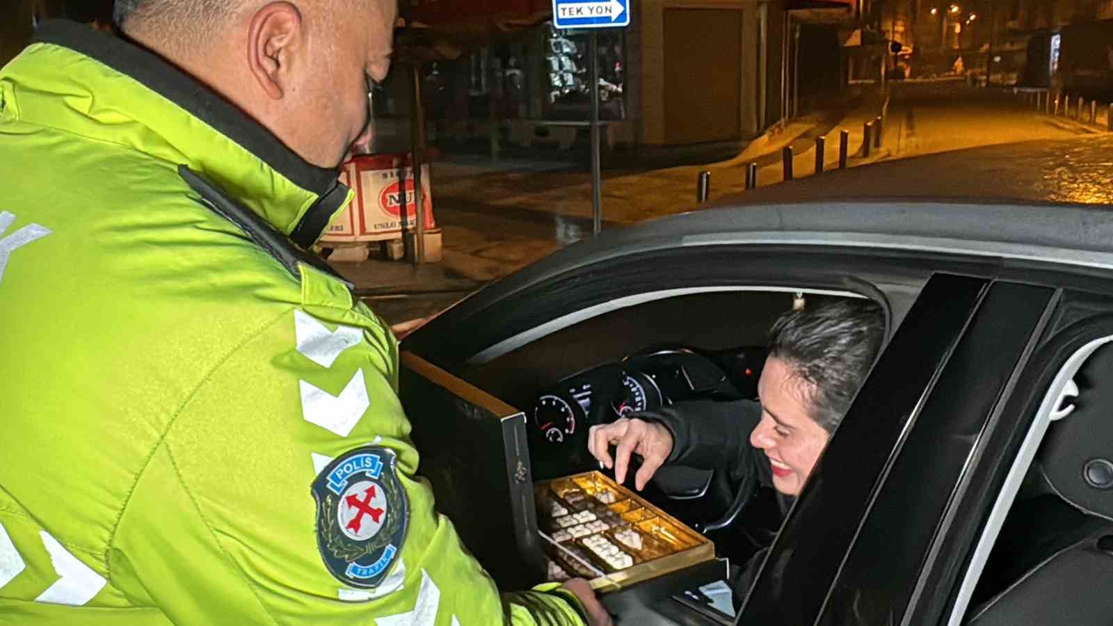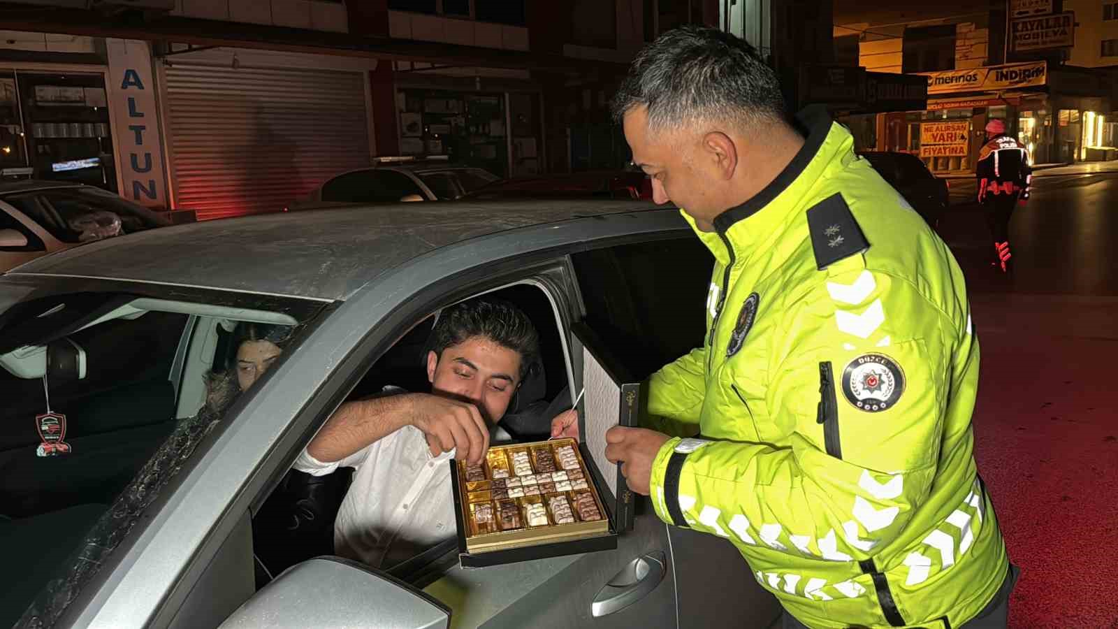 Düzce’de polis ekipleri yılın ilk denetiminde sürücülere bu sefer ceza yerine çikolata dağıttı.