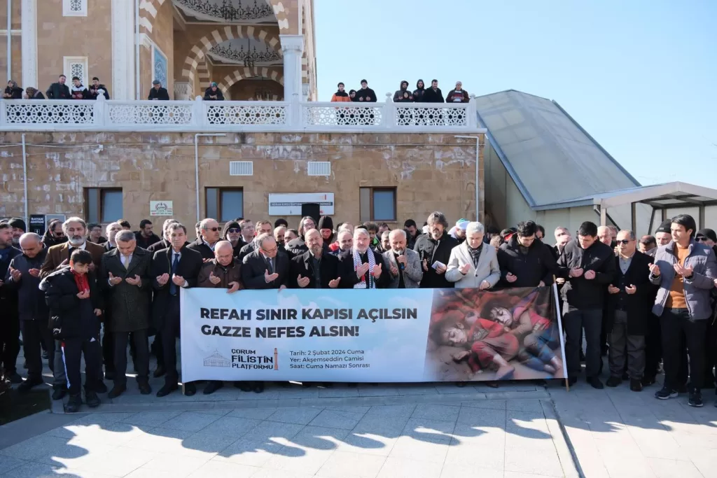 Çorum Filistin Platformu, “Refah sınır kapısı açılsın, Gazze nefes alsın” sloganıyla eylem yaptı.