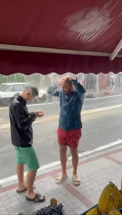 Rize merkezde sıcaktan bunalan gençler, yağmuru fırsat bilerek yağmur altında duş aldı.