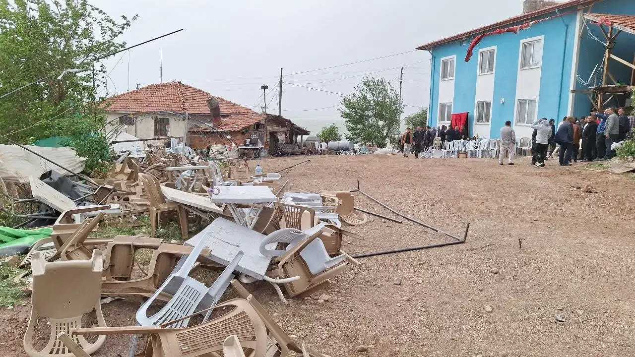 Düğün daveti için kurulan düğün çadırı fırtına nedeniyle yırtılıp uçarken yemek için hazırlanan masa ve sandalyelerde savrularak çevredeki tarla ve bahçelere uçtu. Düğün çadırının fırtına nedeniyle uçmaması için büyük uğraş veren düğün sahibi ve davetlilerin çabaları yeterli olmadı. Yırtılan çadır çok sayıda parçaya ayrılırken, masa ve plastik sandalyelerin bir kısmı da kırıldı.