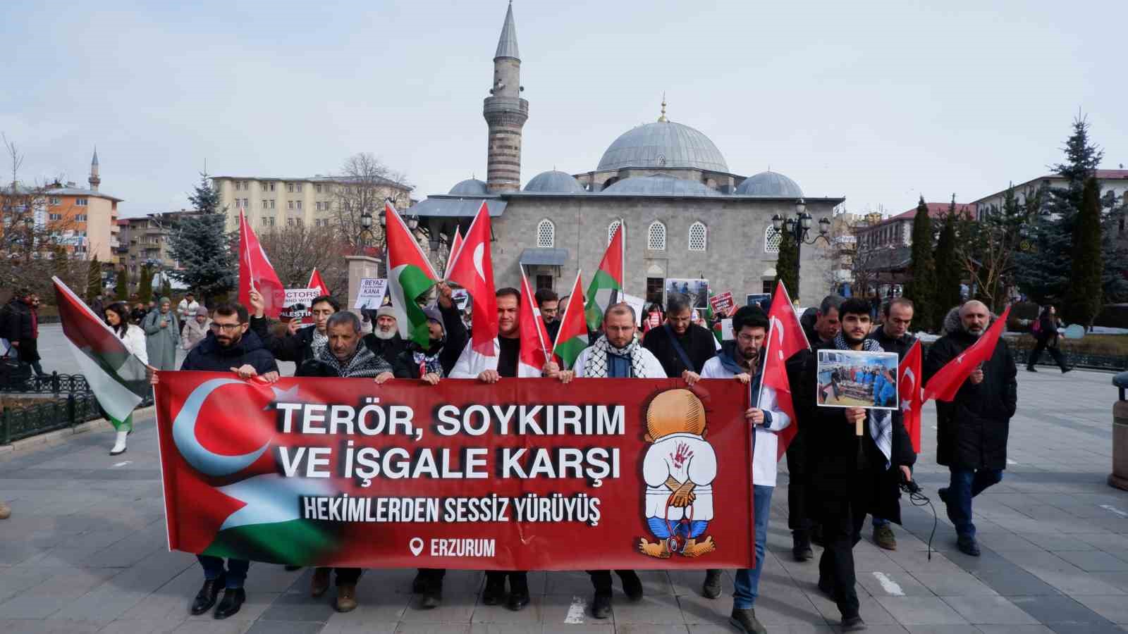 İsrail’in Gazze’ye yönelik saldırılarını protesto etmek amacıyla Erzurum’da görevli sağlık çalışanları sessiz yürüyüşlerinin 14. haftasında bir kez daha biraraya geldiler.