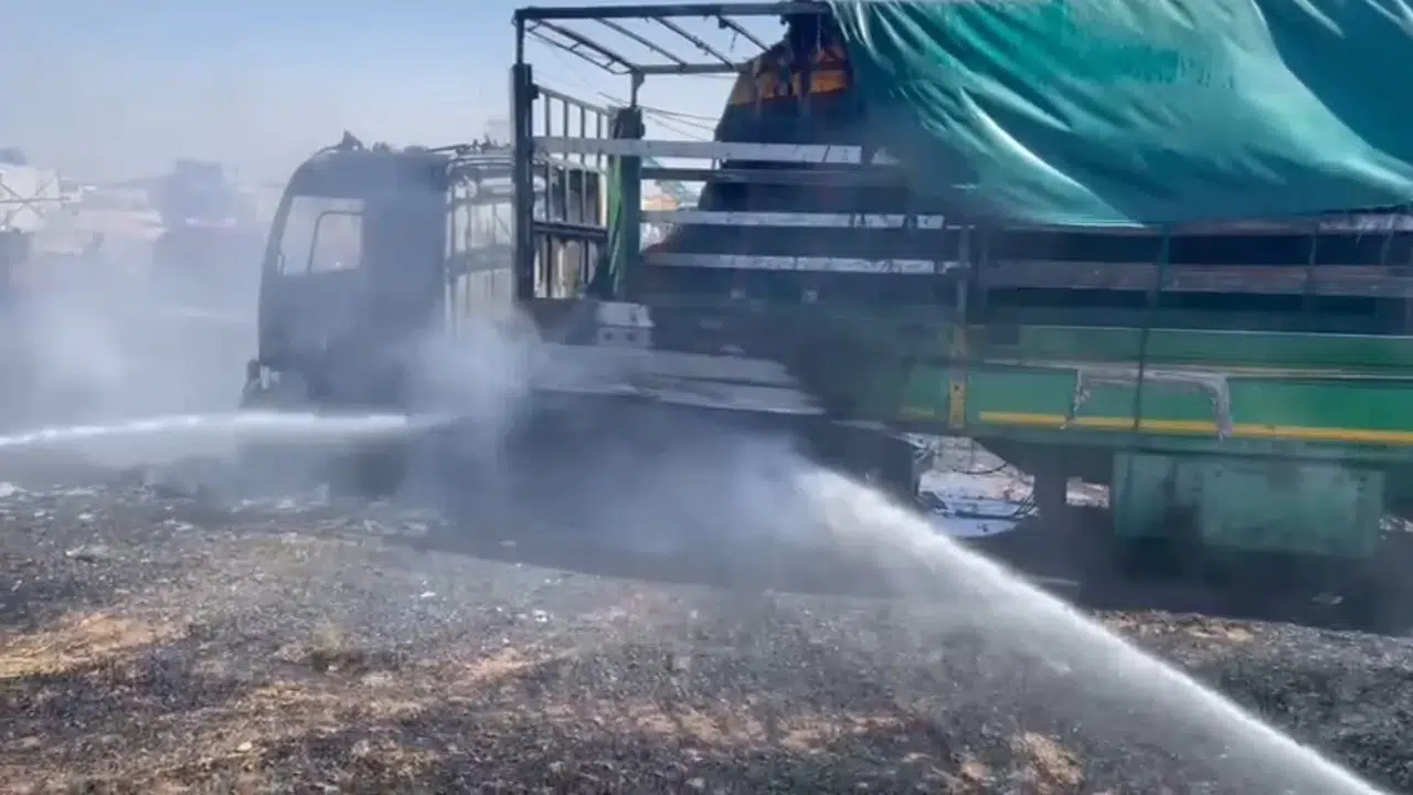 Mardin’in Artuklu ilçesinde saman yüklemeye gelen tır, yanarak kullanılamaz hale geldi.