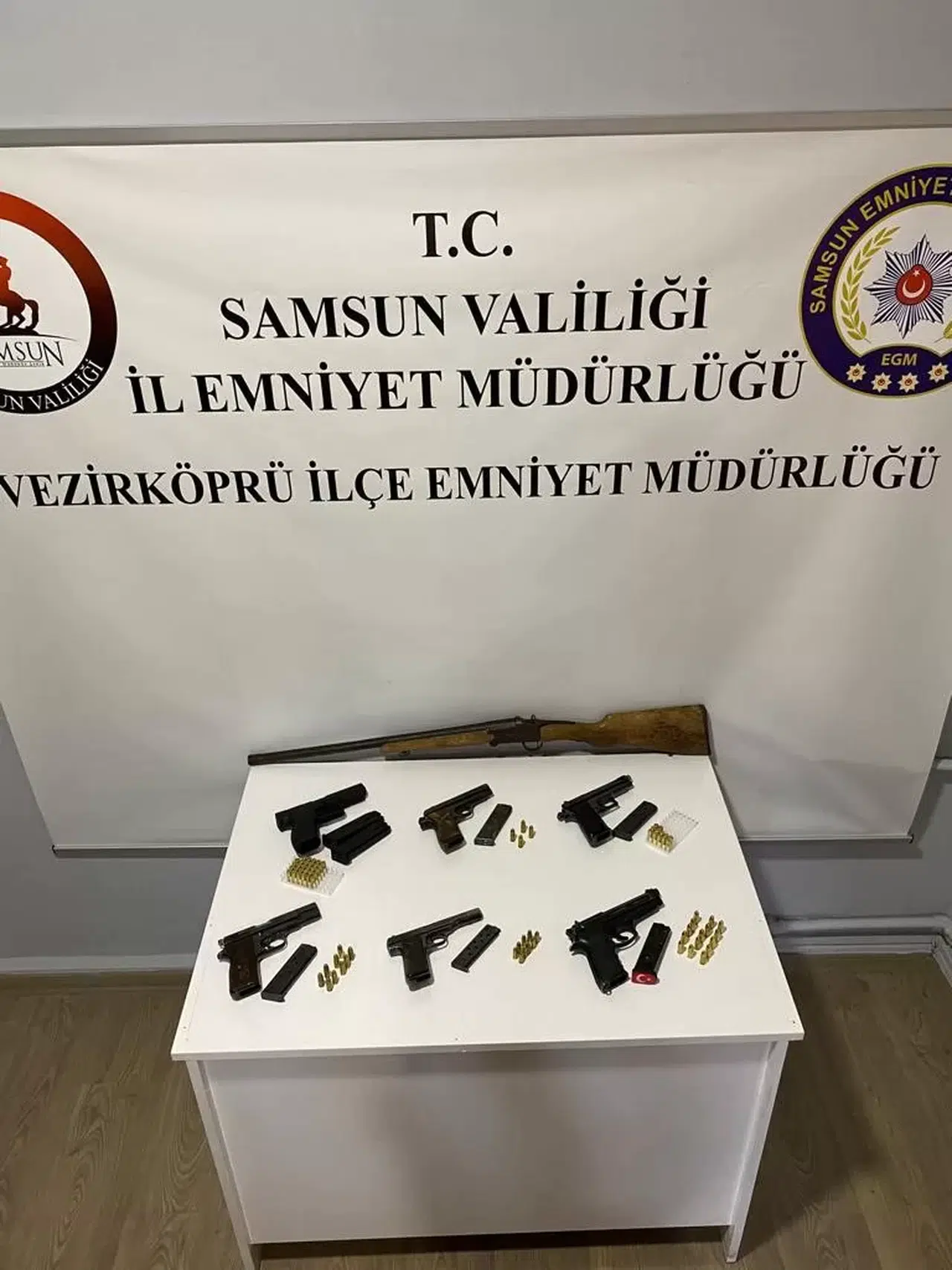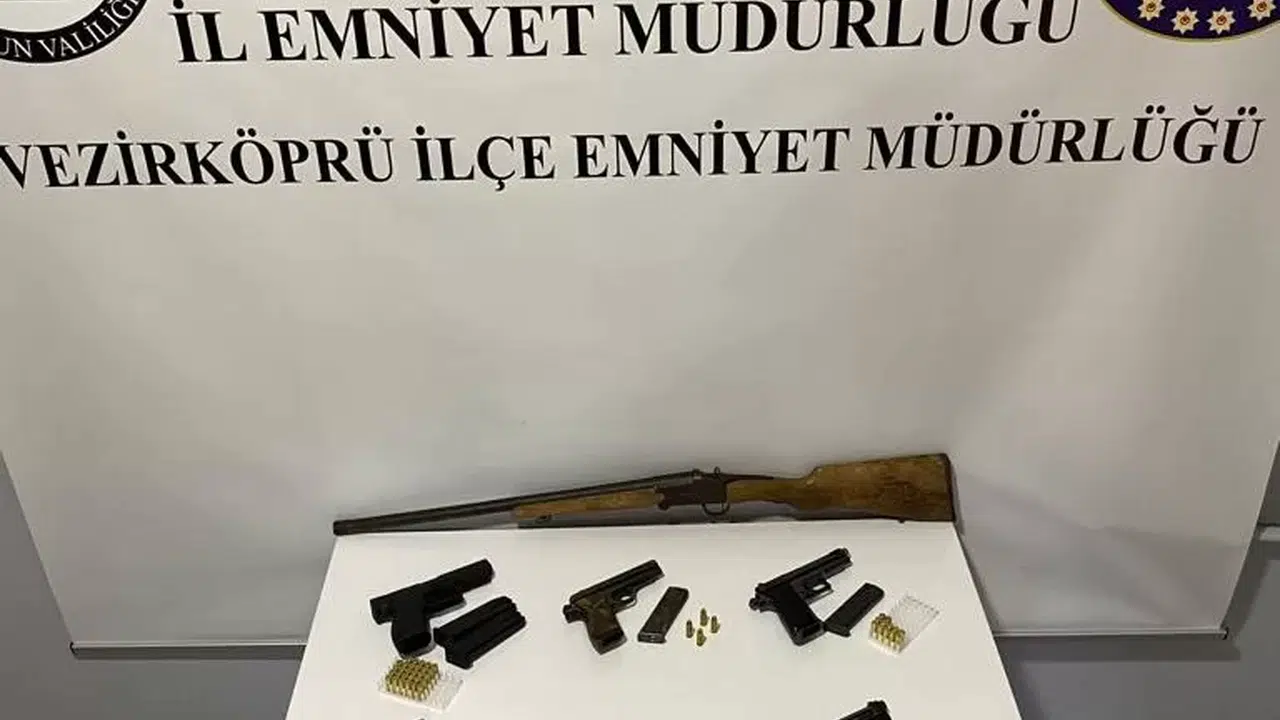 Olay, Samsun’un Vezirköprü ilçesi İstanbul Caddesi’nde meydana geldi. Edinilen bilgiye göre, Vezirköprü İlçe Emniyet Müdürlüğü ekipleri yaptıkları yol uygulamasında 6 adet ruhsatsız tabanca, 68 adet tabancalara ait mermi ve 1 adet ruhsatsız tüfek ele geçirildi. Olayla ilgili soruşturma devam ediyor.
