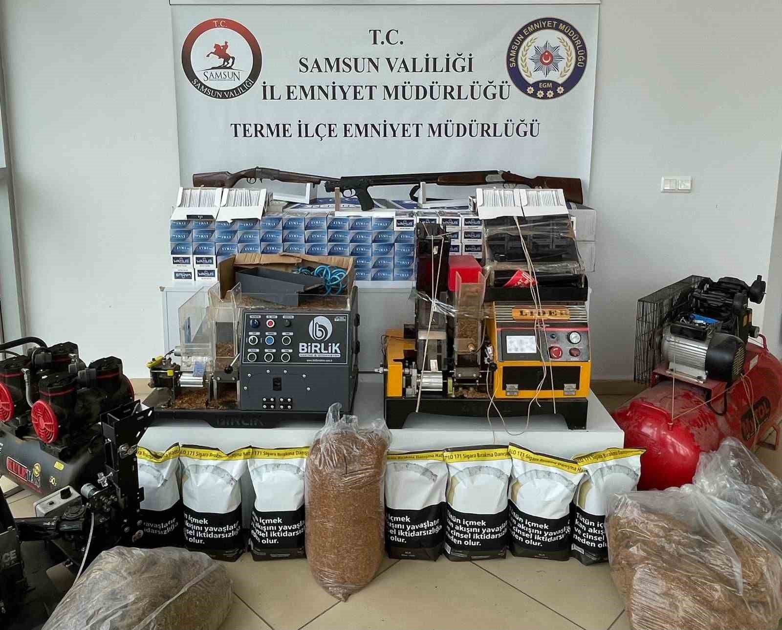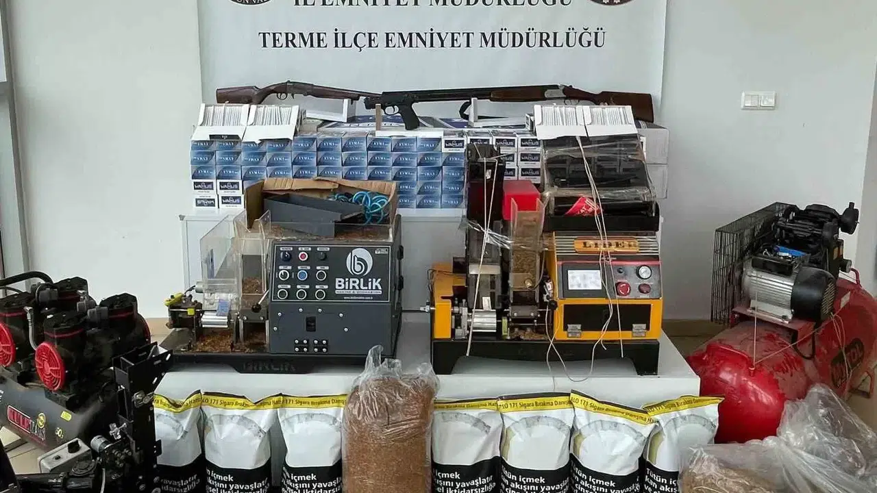 Edinilen bilgiye göre, Terme İlçe Emniyet Müdürlüğü ekipleri tarafından 2 iş yeri ve depoya eş zamanlı operasyon düzenledi. Yapılan aramalarda, 52 bin 520 adet doldurulmuş makaron, 24 bin adet boş makaron, 53 kilo 500 gram kaçak tütün, 4 adet otomatik sigara sarma makinesi, 1 adet manuel sigara sarma makinesi, 3 adet komprasör, 3 bin adet çok amaçlı boş kutu, 1 ruhsatsız kurusıkı tabanca ve 2 adet ruhsatsız tüfek ele geçirildi. Operasyon kapsamında R.A. (43) ve M.Ş. (44) yakalanarak gözaltına alındı. Olayla ilgili soruşturma devam ediyor.