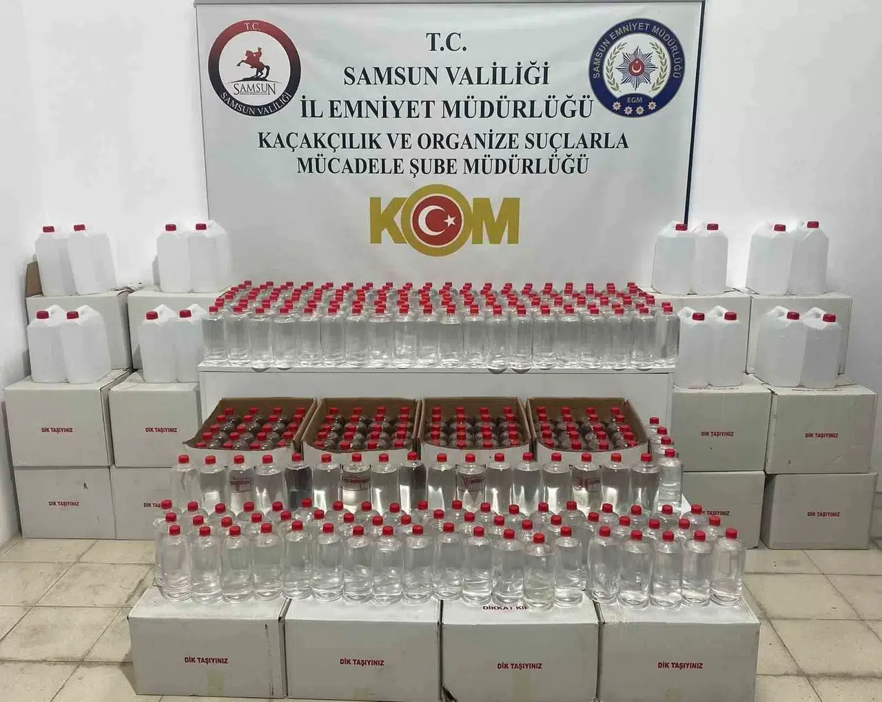 Samsun’da polis tarafından düzenlenen operasyonda kaçak içki yapımında kullanılan 1 ton etil alkol ele geçirildi.
