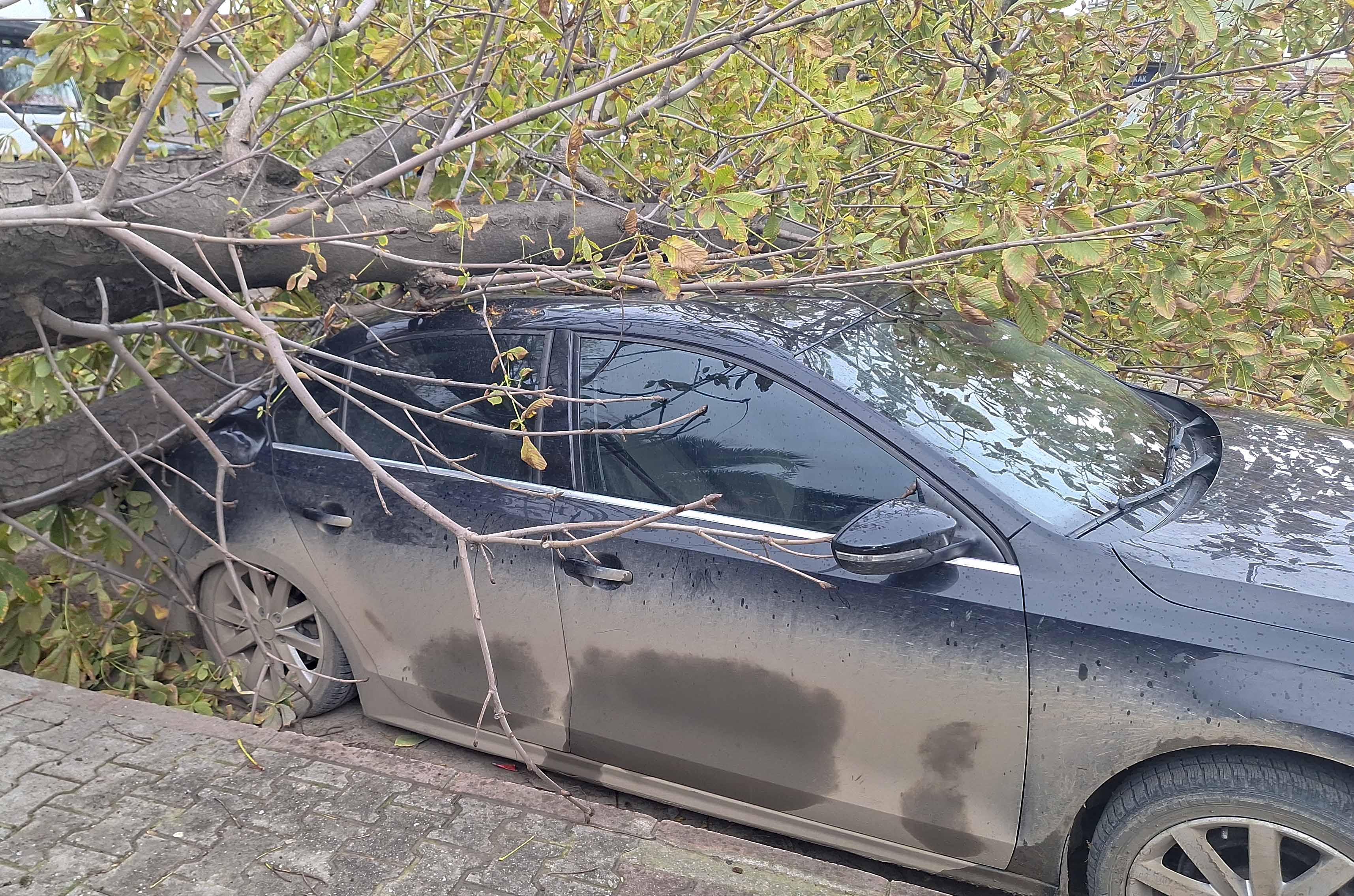 Fatih Mahallesi Fabrika Sokak'ta fırtına nedeniyle bir ağaç, park halindeki iki otomobilin üzerine devrildi.