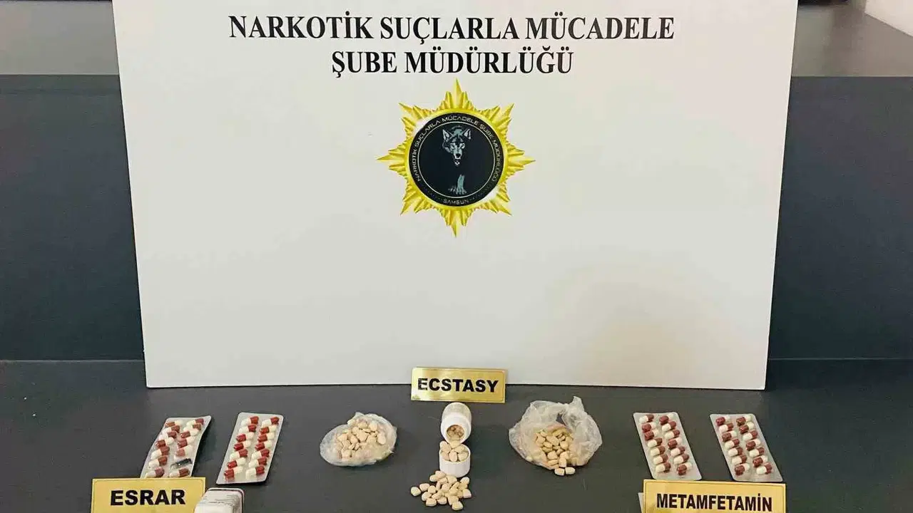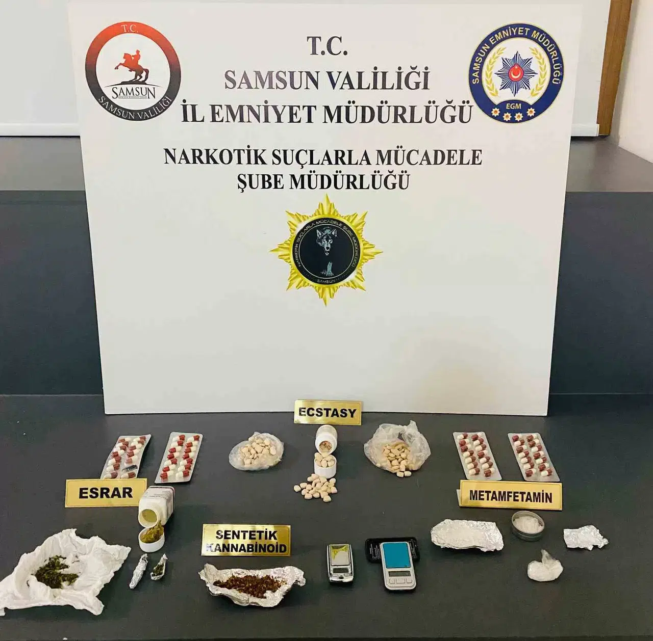 Edinilen bilgiye göre, Samsun Emniyet Müdürlüğü Narkotik Suçlarla Mücadele Şube Müdürlüğü ekipleri alınan istihbari bilgiler doğrultusunda Atakum ilçesi Küçükkolpınar Mahallesi ile İlkadım ilçesi Cedit Mahallesi’nde bulunan 2 zehir tacirinin ikametlerine operasyon düzenledi. Yapılan aramalarda, 1079 adet sentetik ecza, 267 adet ecstasy, 13,51 gram metamfetamin, 3,41 gram esrar, 1,19 gram sentetik kannabinoid, 2 adet hassas terazi, 2 adet uyuşturucu kullanım aparatı ele geçirdi. Olayla ilgili 2 kişi gözaltına alındı.