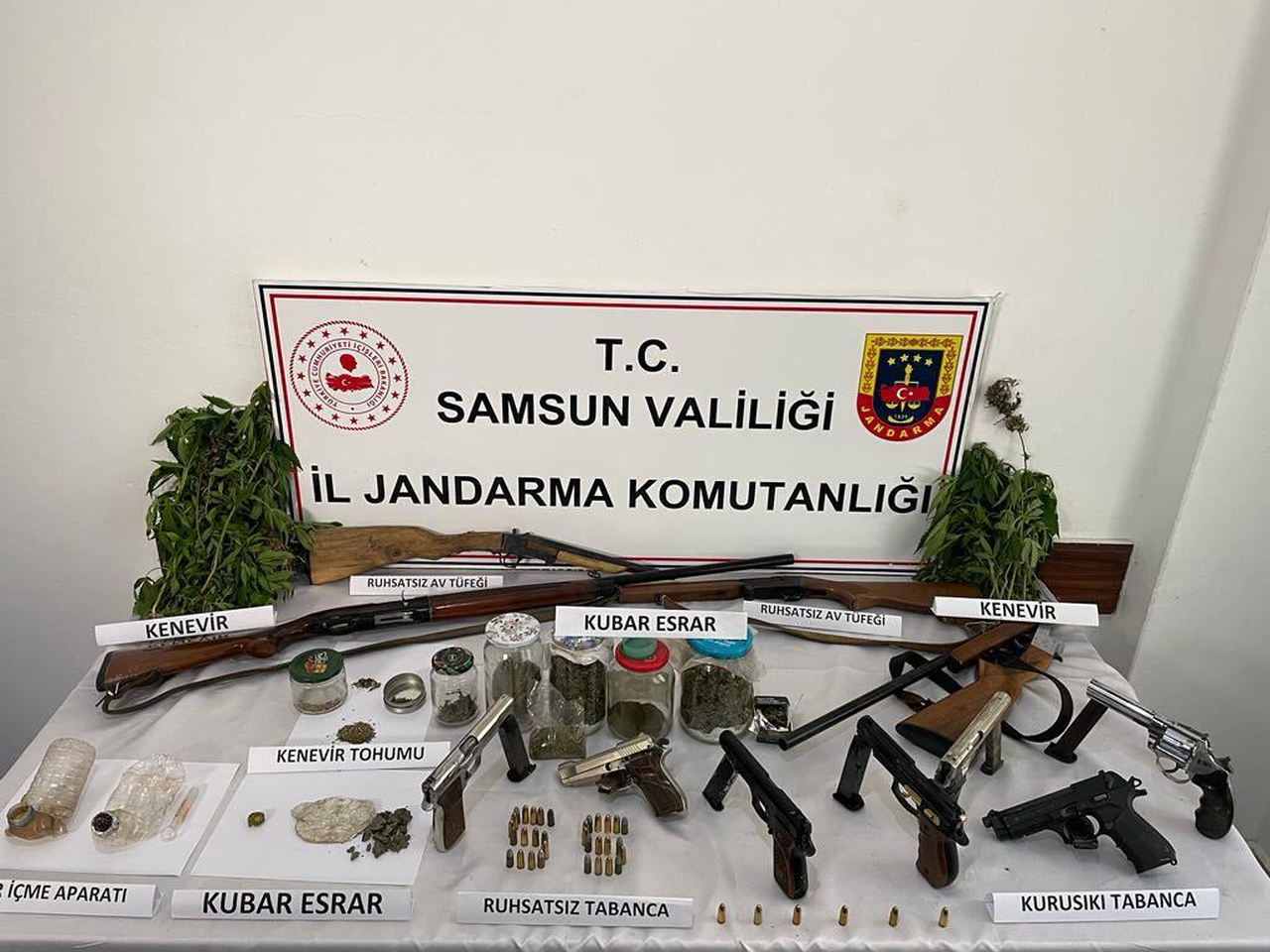 Adreslerde yapılan aramada 358 gram esrar, 117 kök kenevir, 4'ü kurusıkı olmak üzere ruhsatsız 7 tabanca, 4 ruhsatsız av tüfeği ile uyuşturucu kullanma aparatı ele geçirildi.