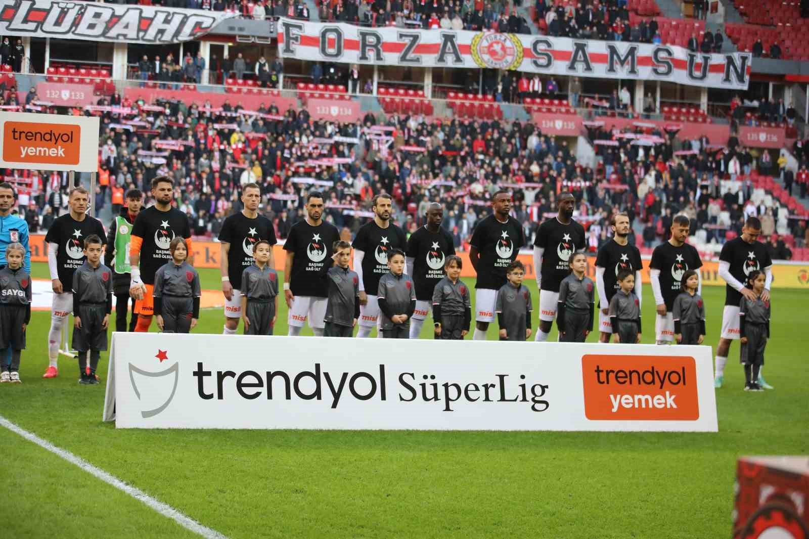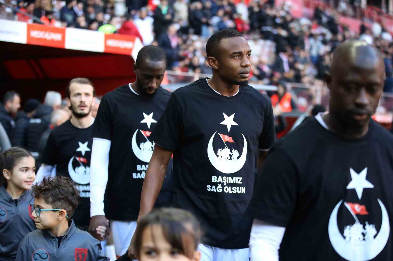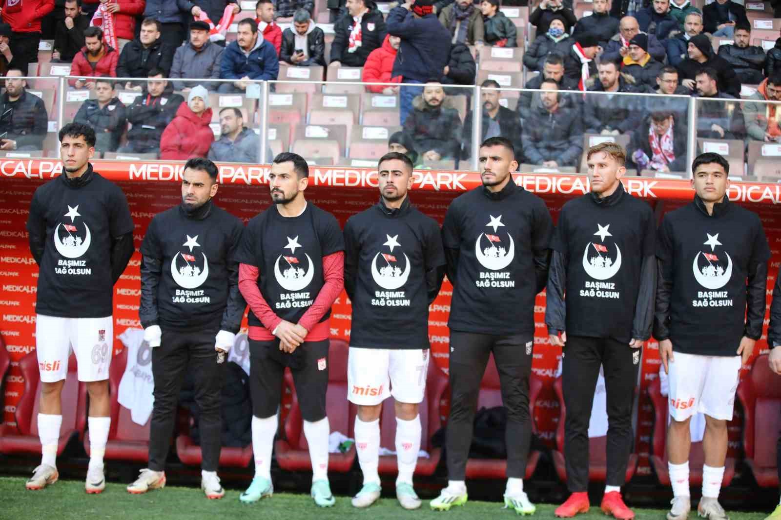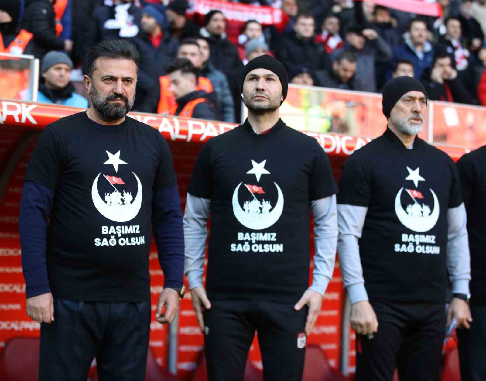 Teknik Direktör Bülent Uygun ve Sivassporlu oyuncular, siyah kol bandıyla sahaya çıkarken, futbolcular seremoniye üzerinde ‘Başımız Sağ Olsun’ yazılı siyah tişörtlerle çıktı.