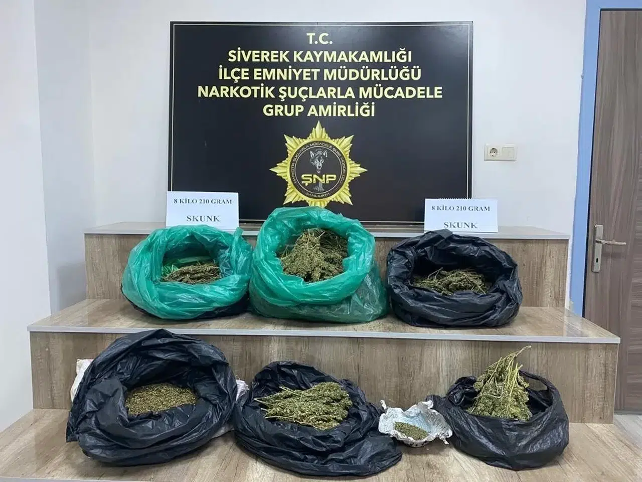 Şahısların kaldığı adreslerde yapılan aramada ise 8 kilo 250 gram skunk maddesi, 79 gram metamfetamin maddesi, 102 gram bonzai maddesi, 18 gram esrar maddesi, 13 adet uyuşturucu hap, 90 gram metamfetamin katkı maddesi, 2 adet hassas terazi, 4 adet ruhsatsız silah, 2 adet cep telefonu ile uyuşturucu ticaretinden elde edildiği değerlendirilen 11 bin TL para ele geçirildi.