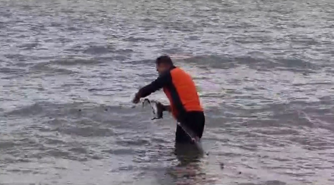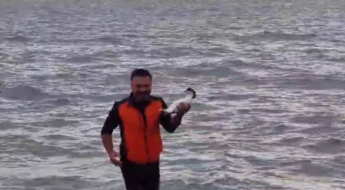 Karadeniz’de yüzen karabatağı bir köpek dakikalarca suda yüzerek kovaladı. Sonunda pes eden köpekten kurtulan karabatak bu seferde balıkçı ağlarına takıldı. O sırada bir vatandaş buz gibi suya girerek karabatağı ağlardan kurtardı.