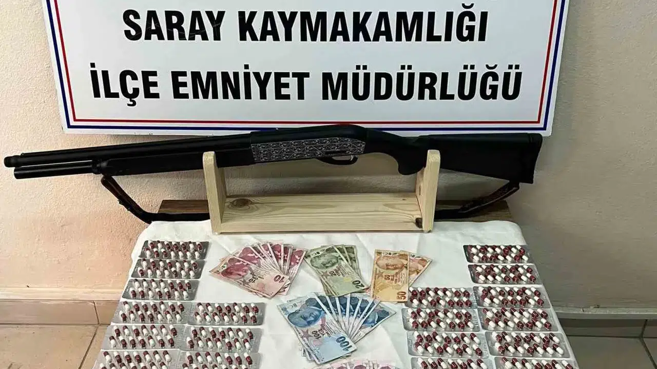Tekirdağ İl Emniyet Müdürlüğü Saray İlçe Emniyet Müdürlüğü Suç Önleme ve Soruşturma Büro Amirliği ekiplerince, Saray’da iki adrese eş zamanlı operasyon düzenlendi. Operasyonlarda 509 adet sentetik ecza, uyuşturucudan elde edildiği değerlendirilen 3 bin 450 TL ve 1 adet ruhsatsız av tüfeği ele geçirildi.
