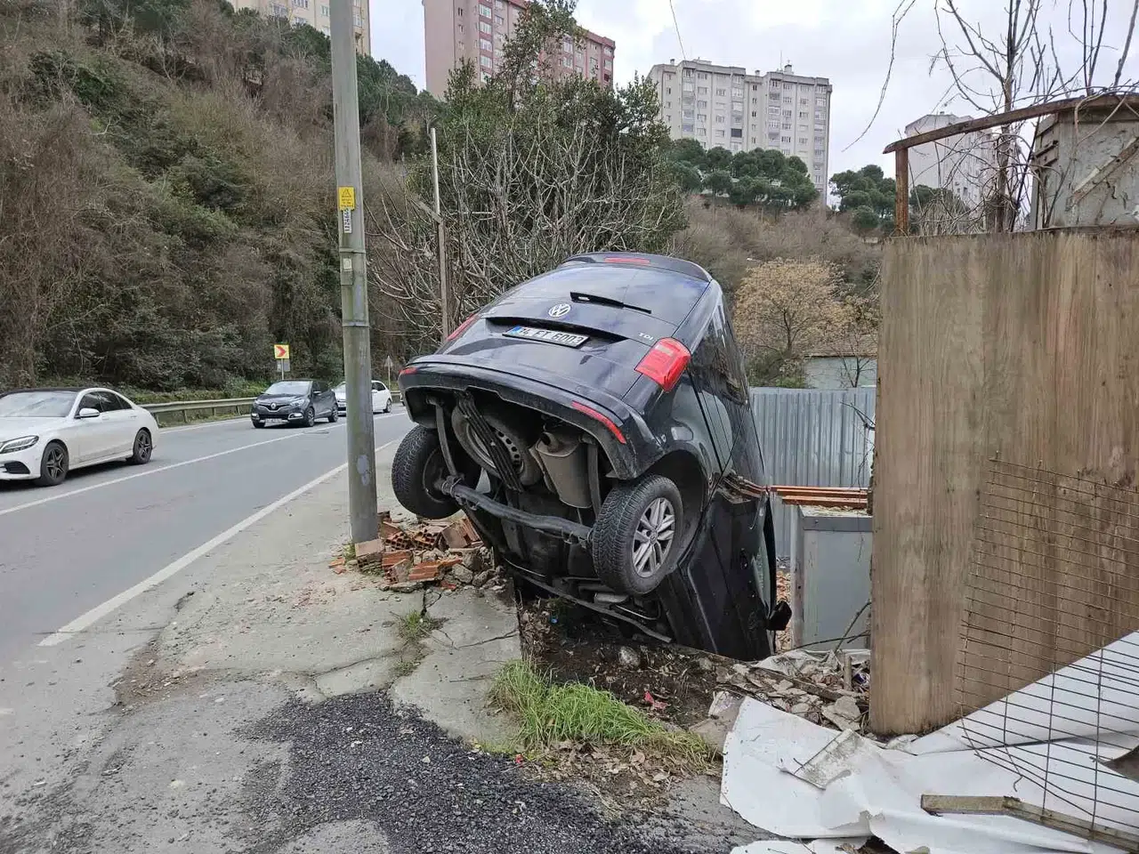 Kesin Karar Ulusal Sarıyer’de Yoldan Çıkan Araç İnşaat Alanının Duvarında Asılı Kaldı: O Anlar Kamerada