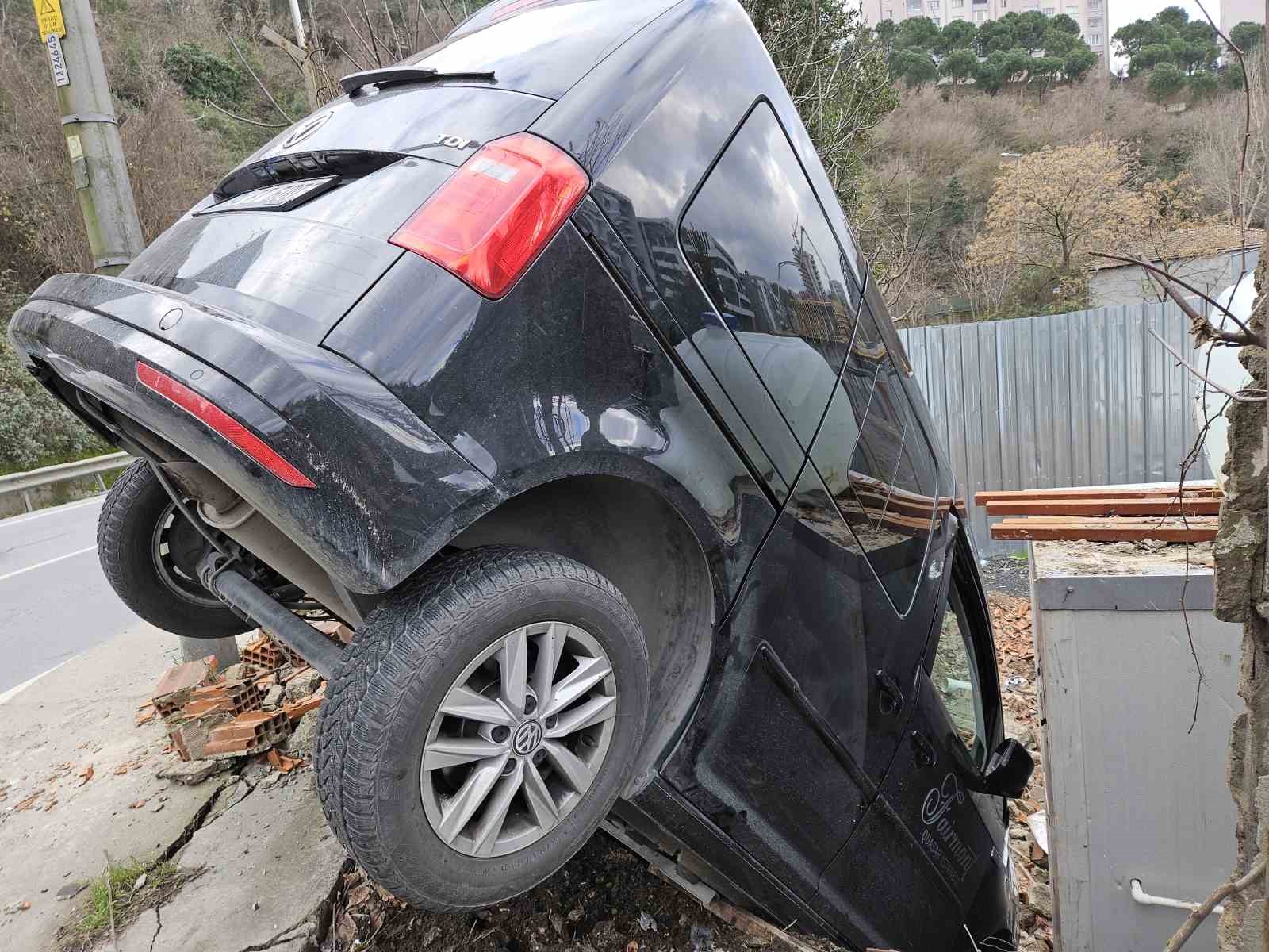 Sarıyer’de seyir halindeki sürücünün direksiyon hakimiyetini kaybetmesi sonucu araç, inşaat sahasındaki duvarı yıkarak boşluğa düştü. Aracın bir kısmının duvarda asılı kaldığı kaza güvenlik kamerasına yansıdı.