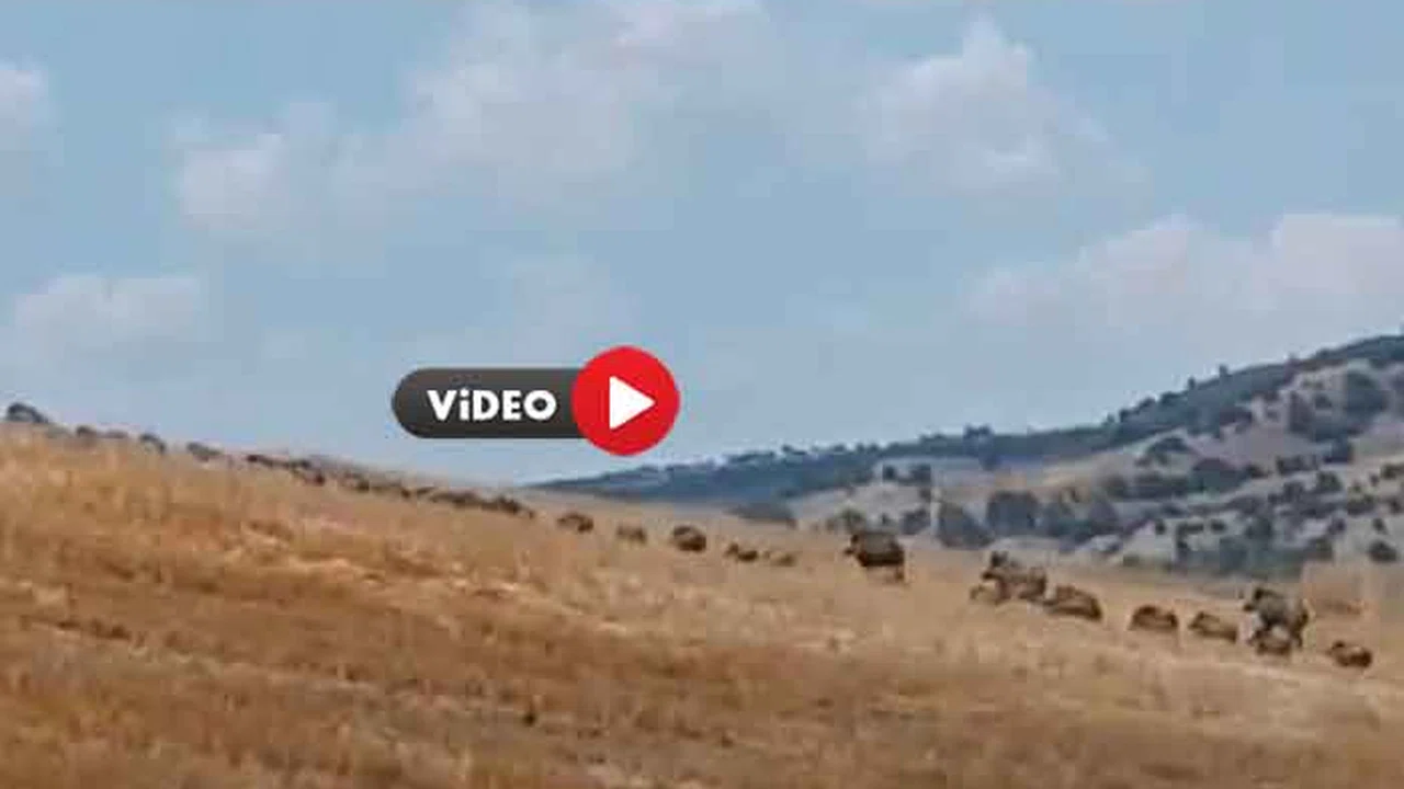 Büyük bir şaşkınlık yaşayan vatandaş, domuz sürüsünü cep telefonu kamerası ile kayıt altına aldı. Görüntülerde 60’a yakın yaban domuzunun arazide ilerlediği görüldü. (İHA)