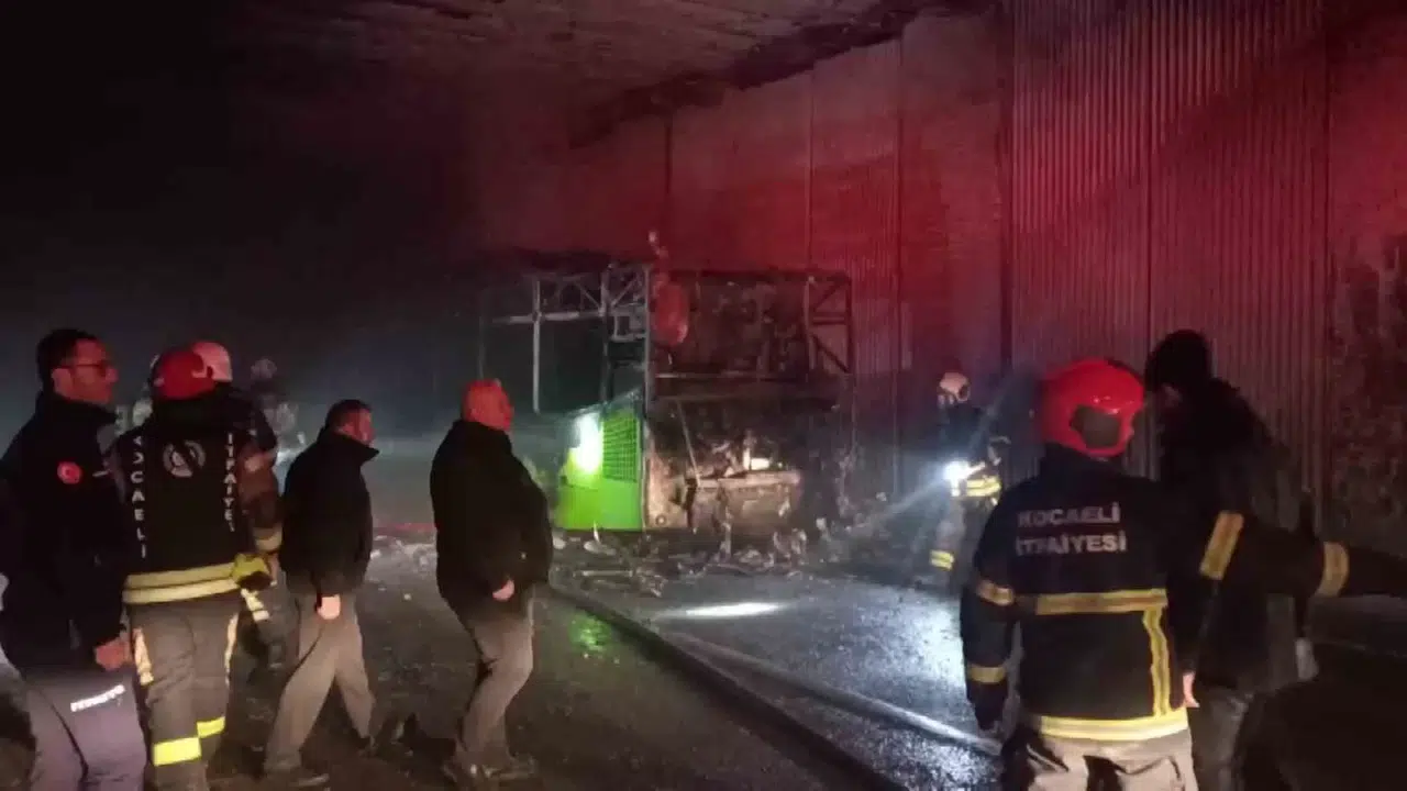 Kocaeli’nin İzmit ilçesinde seyir halindeki halk otobüsünün yanması neticesinde geriye sadece aracın iskeleti kaldı.