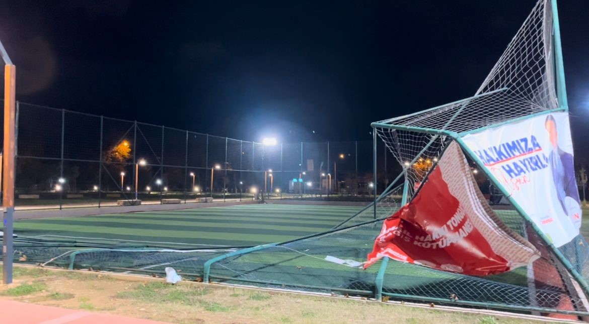 Bursa’da etkisini artıran şiddetli lodos, millet bahçesinde bulunan bir halı sahayı yerle bir etti.