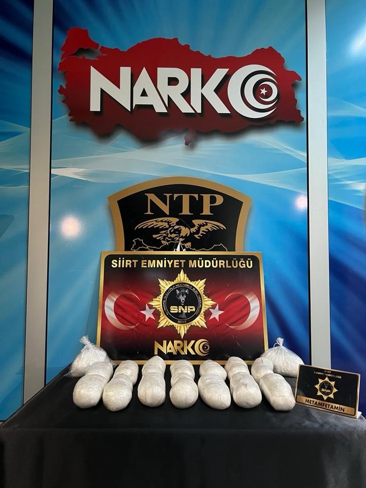 Siirt Valiliği İl Emniyet Müdürlüğü Narkotik Suçlarla Mücadele Şube Müdürlüğü ekiplerince kent genelinde uyuşturucu madde kullanan ve satan şahıslara yönelik çalışmalar sürüyor. Çalışmalar sonucunda; Siirt’in Baykan ilçesi Ziyaret uygulama noktasında M.Ş. ve S.F. isimli şahısların aracında yapılan aramada 8 kilo 215 gram metamfetamin maddesi ele geçirildi. Olayla ilgili devam eden detaylı çalışmalarda S.F.’nin Van’daki ikametinde yapılan aramada 1 kilo 35 gram daha metamfetamin ele geçirilerek, toplamda 9 kilo 250 gram metamfetamin ele geçirildi.
