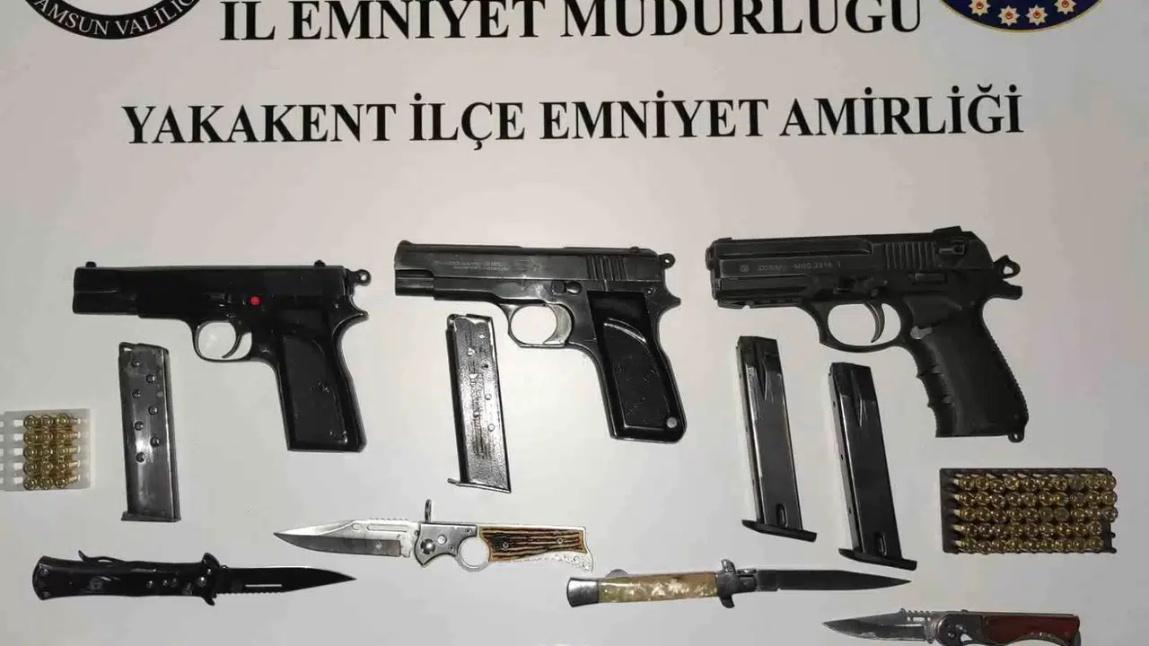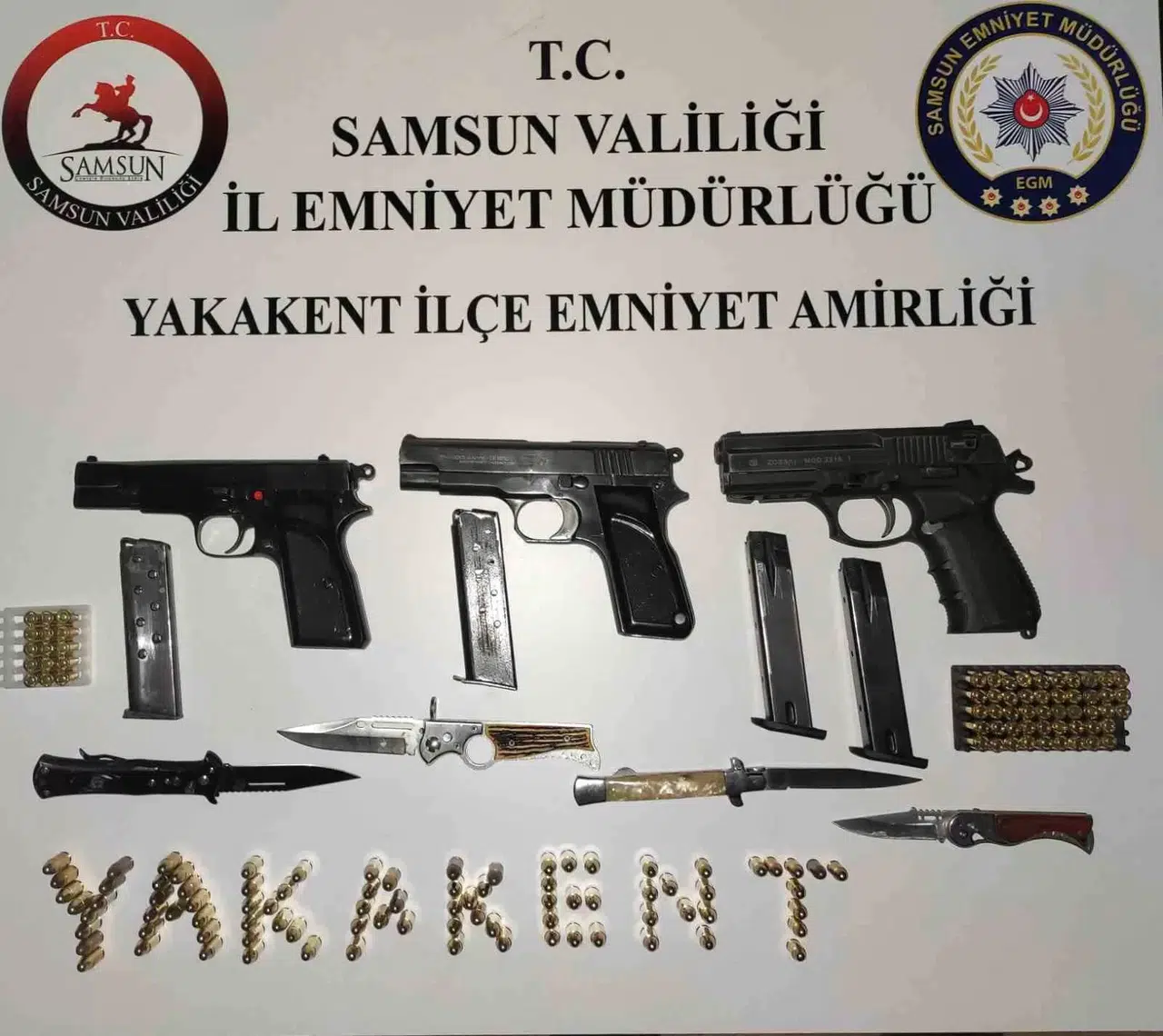 İl Emniyet Müdürlüğü Yakakent İlçe Emniyet Amirliği ekipleri, Yakakent ilçesinde silah kaçakçılığı yaptığı gerekçesiyle şüpheli N.Ş.’yi bir kahvehanede oyun oynadığı esnada yakaladı. Şahsın yapılan üst aramasında bir adet bıçak, ikametinde ise çeşitli bölmelere zulalanmış vaziyette 2 adet ruhsatsız tabanca, 4 adet sustalı bıçak, 101 adet tabanca fişeği ve 48 adet kurusıkı tabanca fişeği ele geçirildi.