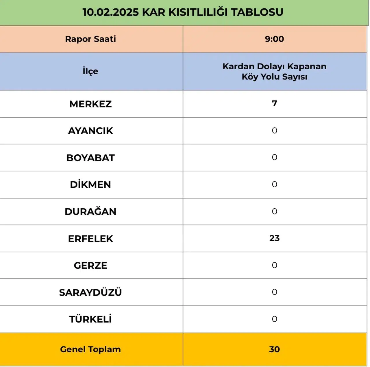 Sinop Valiliği’nden bu sabah yapılan açıklamada ise Merkez ilçede 7, Erfelek ilçesinde 23 olmak üzere toplam 30 köy yolunun ulaşıma kapalı olduğu bildirildi.
