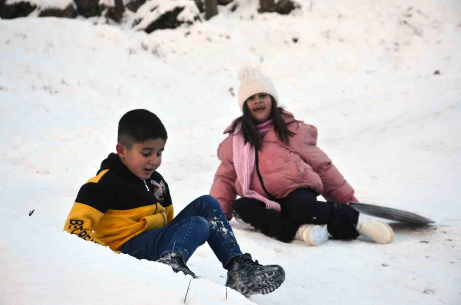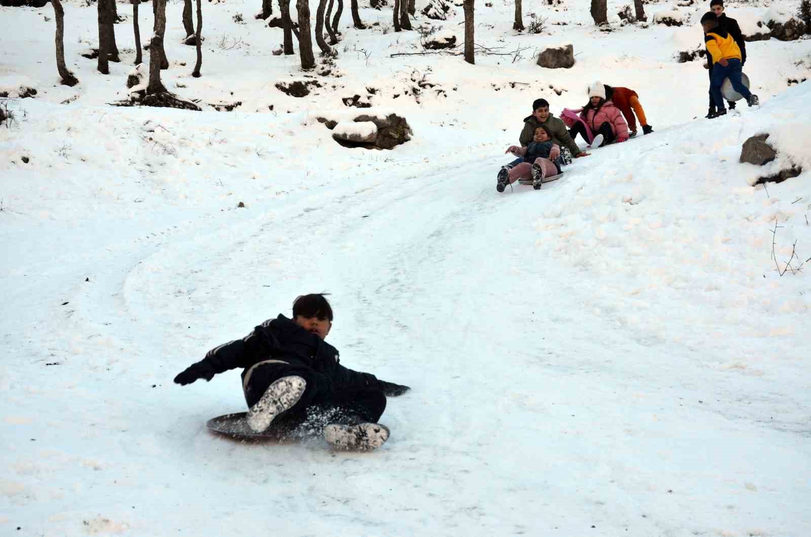 Şırnak’ın Beytüşşebap ilçesinde çocuklar, kar yağışı sonrası buz pistine dönüşen yerlerde leğen ve tepsi ile kaymanın keyfini çıkardı.
