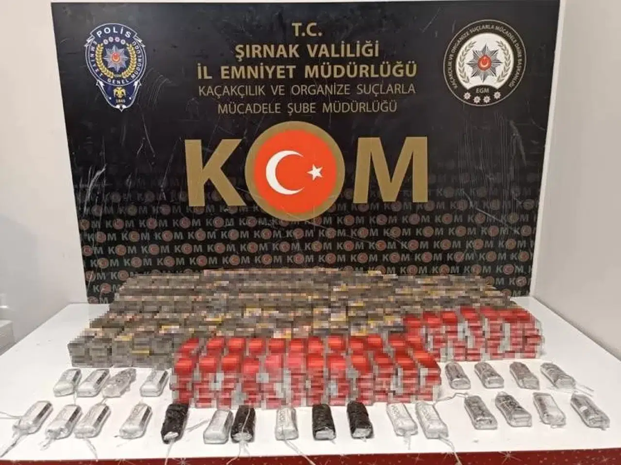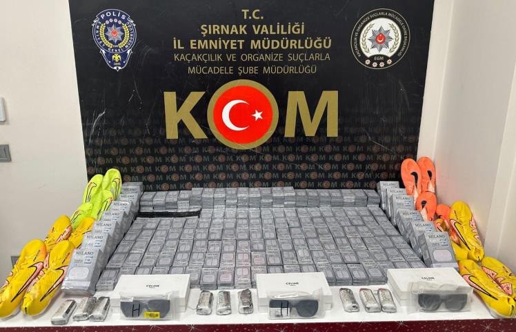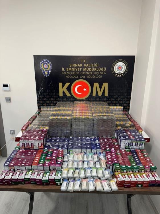 Şırnak İl Emniyet Müdürlüğü ve İl Jandarma Komutanlığı birimleri tarafından terörün finans kaynaklarına operasyon düzenlenerek, silah, uyuşturucu madde, gümrük kaçağı malzemeye el konuldu. Şırnak ve Habur Sınır Kapısı’nda yapılan operasyonlarda, 18 bin 96 paket sigara, 5 bin 600 adet makaron, bin 69 adet elektronik emtia (elektronik sigara, kaynak makinesi), 799 adet sahte para (100 ve 200 TL banknotlar), 380 adet muhtelif emtia (spor ayakkabı, makyaj malzemesi, gözlük), 100 paket elektronik sigara tütünü, 66 kilogram çay, 60 adet cep telefonu aksesuarı (şarj kablosu, şarj adaptörü), 16 adet cep telefonu, 7 şişe kaçak içki, 1 adet şarjör, 1 adet tabanca, 14 adet sentetik ecza, 1.39 gram metamfetamin maddesi, 0.7 gram esrar maddesi ele geçirildi.