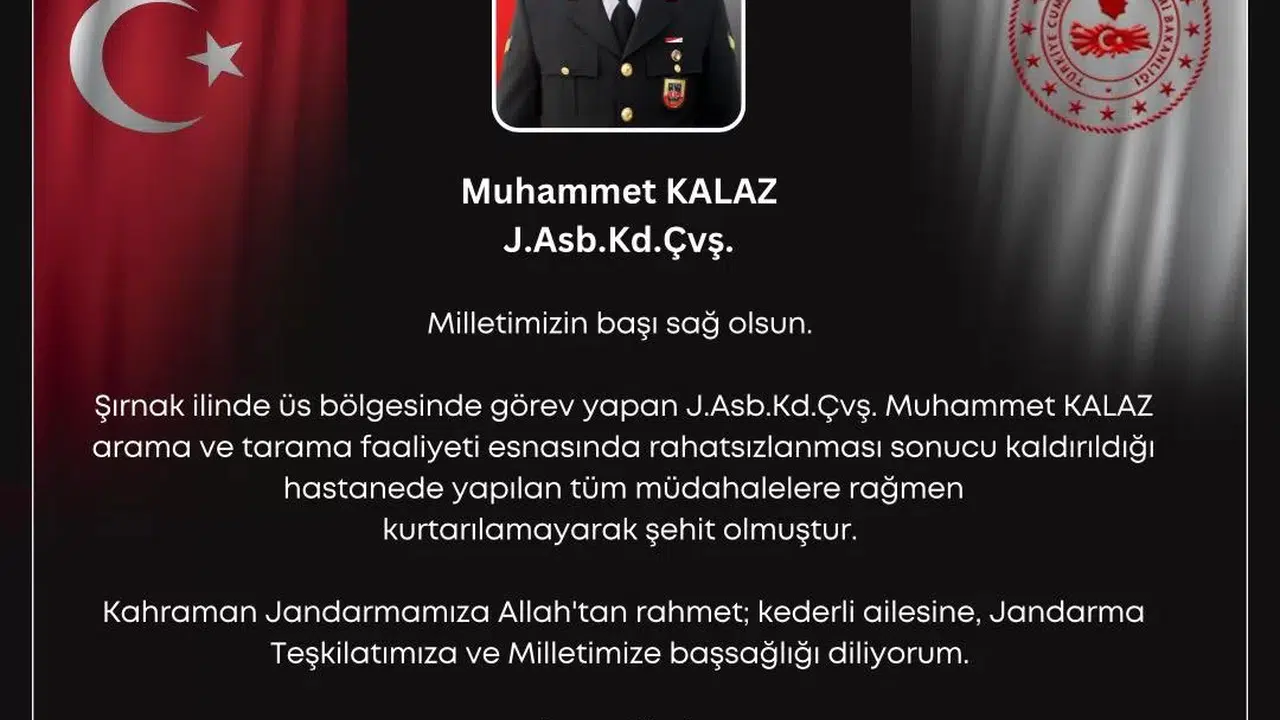 İçişleri Bakanı Ali Yerlikaya, Şırnak’ta üs bölgesinde görev yapan Jandarma Astsubay Kıdemli Çavuş Muhammet Kalaz’ın arama ve tarama faaliyeti esnasında rahatsızlanması sonucu kaldırıldığı hastanede şehit olduğunu açıkladı.