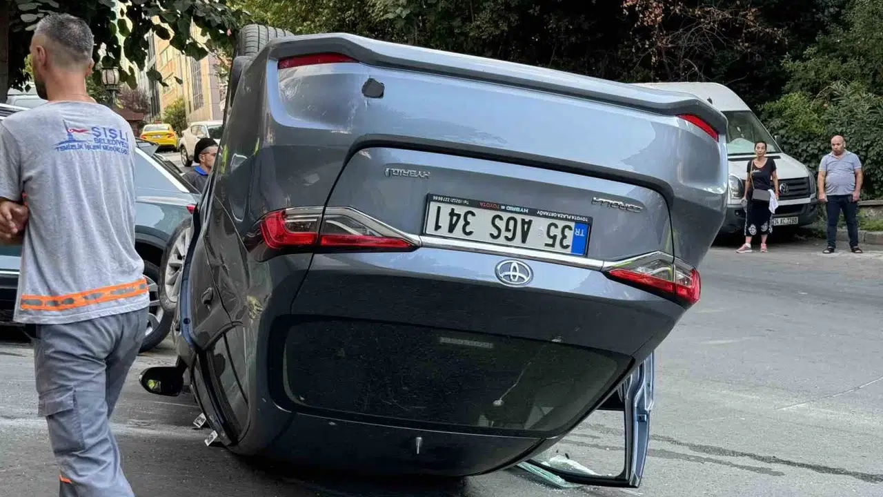 İstanbul Şişli’de ters yönden yokuş aşağı süratle seyreden kadın sürücü fren yerine gaza basınca takla attı. Araçta maddi hasar oluşurken kazada ölen ya da yaralanan olmadı.