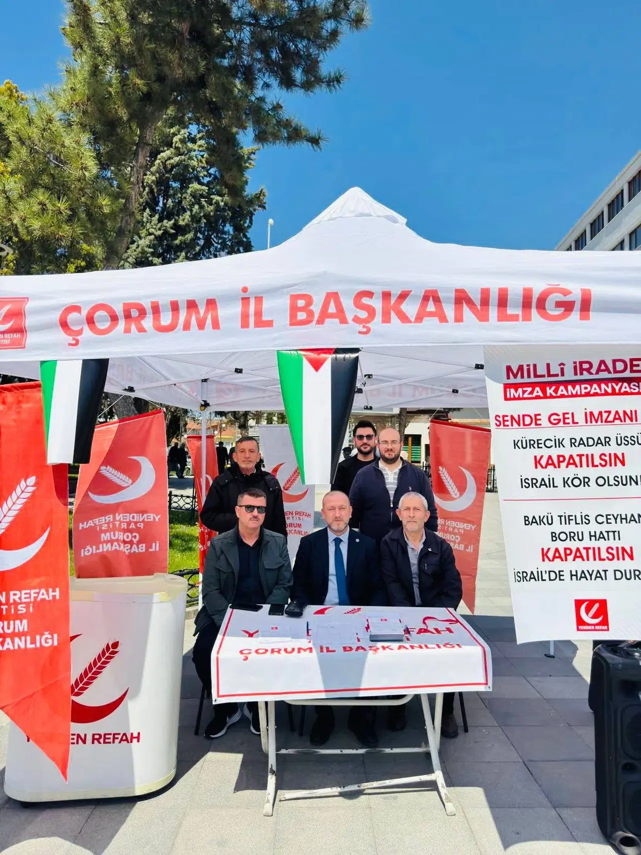 Yeniden Refah Partisi Çorum İl Başkanlığı tarafından Kürecik Radar Üssü ile Bakü Tiflis Ceyhan Boru Hattı'nın kapatılması talebiyle Türkiye genelinde eş zamanlı olarak yürütülen geniş kapsamlı imza kampanyası için sahaya inildi. Kürecik Radar Üssü kapatılsın İsrail kör olsun, Bakü Tiflis Ceyhan Boru Hattı kapatılsın İsrail'de hayat dursun sloganlarıyla hayata geçirilen çalışma kapsamında parti teşkilatları il ve ilçe merkezlerinde kurulan stantlarla vatandaşlardan imza toplamaya başladı.