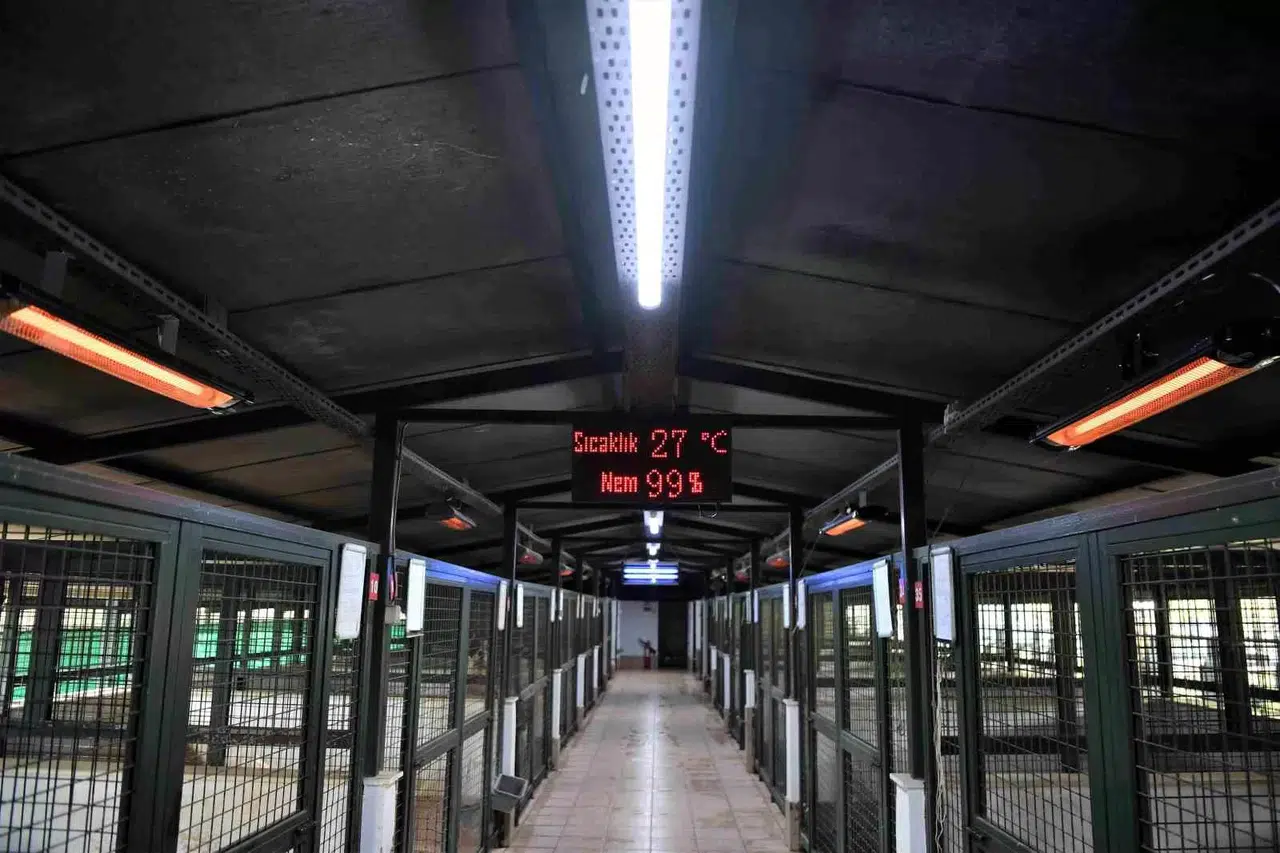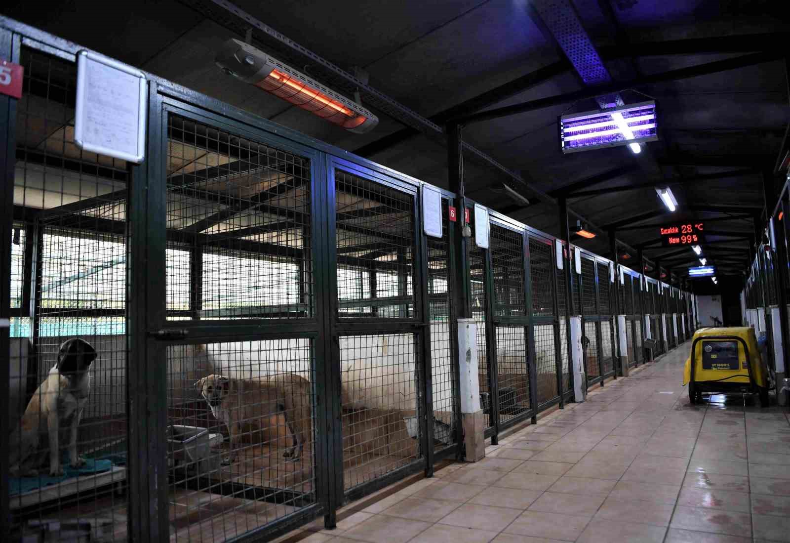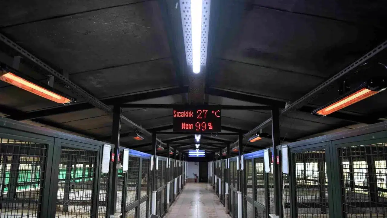 Konyaaltı Belediyesi Sokak Hayvanları Sağlık ve Rehabilitasyon Merkezi’nde tedavi edilen sokak hayvanları, elektrikli ısıtıcılarla soğuktan korunuyor.