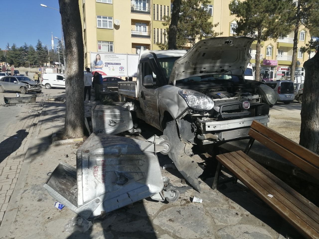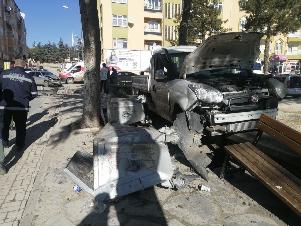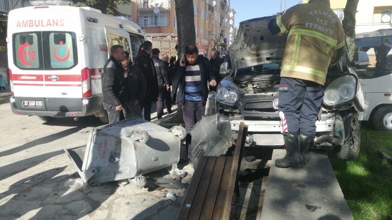 Isparta’nın Yalvaç ilçesinde servis kamyoneti ile otomobilin kavşakta çarpışması sonucu 1 kişi yaralandı. Kamyonetin kaldırımda bulunan oturma grupları ve ardından çöp kovalarına çarparak durabildiği kazada ortalık savaş alanına döndü.