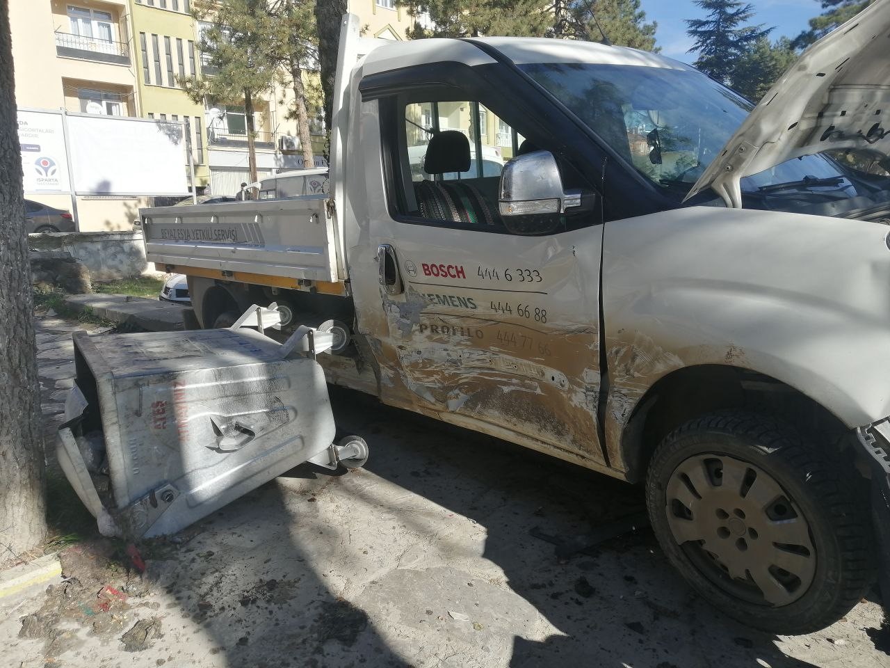 Kaza, Yalvaç Çarşı merkezi hastane caddesinde yaşandı. Edinilen bilgiye göre Veli Kara yönetimindeki 32 YB 004 plakalı beyaz eşya servisi Fıat marka kamyonete Bahçe içi Sokaktan kontrolsüz giriş yapan Mehmet Ali Kalkanlı kontrolündeki 48 FY 177 plakalı araç çarptı. Çarpışmanın etkisi ile servis aracı eski hastane kaldırımına sürüklenerek kaldırımda bulunan oturma bankaları ve belediye çöp kovalarına çarparak durabildi. Ortalığın savaş alanına döndüğü kaza için ihbar üzerine ambulans, itfaiye ve trafik ekipleri sevk edildi. Kazada servis aracının sürücüsü Veli Kara yaralanırken olay yerindeki ilk müdahalenin ardından tedavi için Yalvaç hastanesine kaldırıldı.