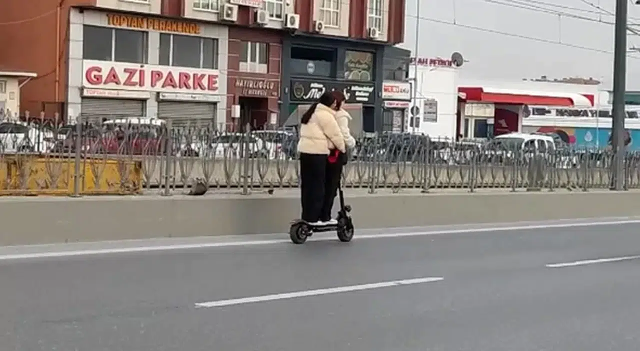 Olay, dün saat 14.00 sıralarında Sultangazi Eski Edirne Asfaltı üzeri Gaziosmanpaşa istikametinde yaşandı. Tek kişinin kullanımı için tasarlanan elektrikli scootera binen 2 kız arkadaş, güvenlik önlemi almadan trafikte kilometrelerce yolculuk yaptı. Cadde üzerinde ve yoğun trafiğin arasında kendilerini uyarmak için korna çalan diğer sürücülere aldırış dahi etmeden ilerleyen iki arkadaş yolculuk esnasında ilçe değiştirip Sultangazi’den Gaziosmanpaşa’ya geçtiler. O anları ise başka bir sürücü cep telefonu kamerasıyla kaydetti.
