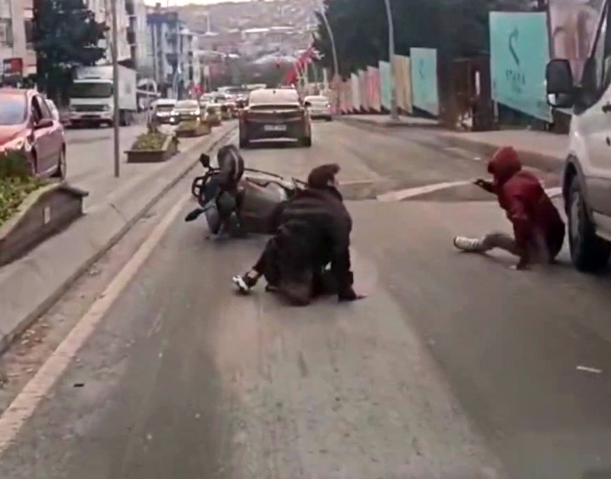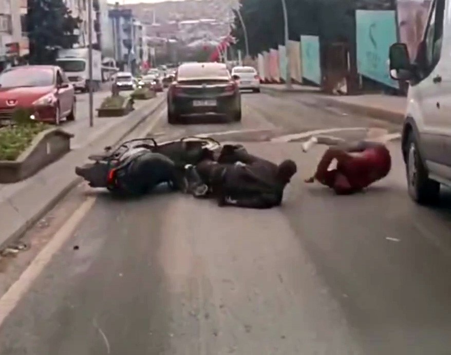 Olay, dün saat 17.00 sıralarında Esentepe Mahallesi Yunus Emre Bulvarı üzerinde meydana geldi. Hiçbir güvenlik önlemi almadan motosiklete binen iki arkadaş, yolculuğa başladı. Bulvar üzerinde ilerleyen motosiklet, kasisten geçerken kontrolden çıkarak devrildi. Motosikletin üzerindeki iki arkadaş da yola savruldu. Motosikletten düşenlerden biri, yuvarlanarak o esnada seyir halinde bulunan ticari aracın tekerinin önüne düştü. Yaşanan olayda şoförün dikkati ise muhtemel bir felaketin önüne geçti. Durumu fark eden diğer sürücüler hemen yardıma koşarken, o anlar saniye saniye araç içi kamerasına yansıdı.