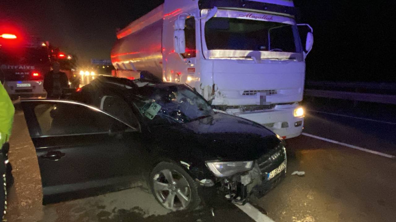 Kocaeli D-100 Karayolunda tanker, park halindeki otomobile çarparak 200 metre sürükledi. Kazada otomobil kağıt gibi ezilirken, sürücüsü ise yaralandı.