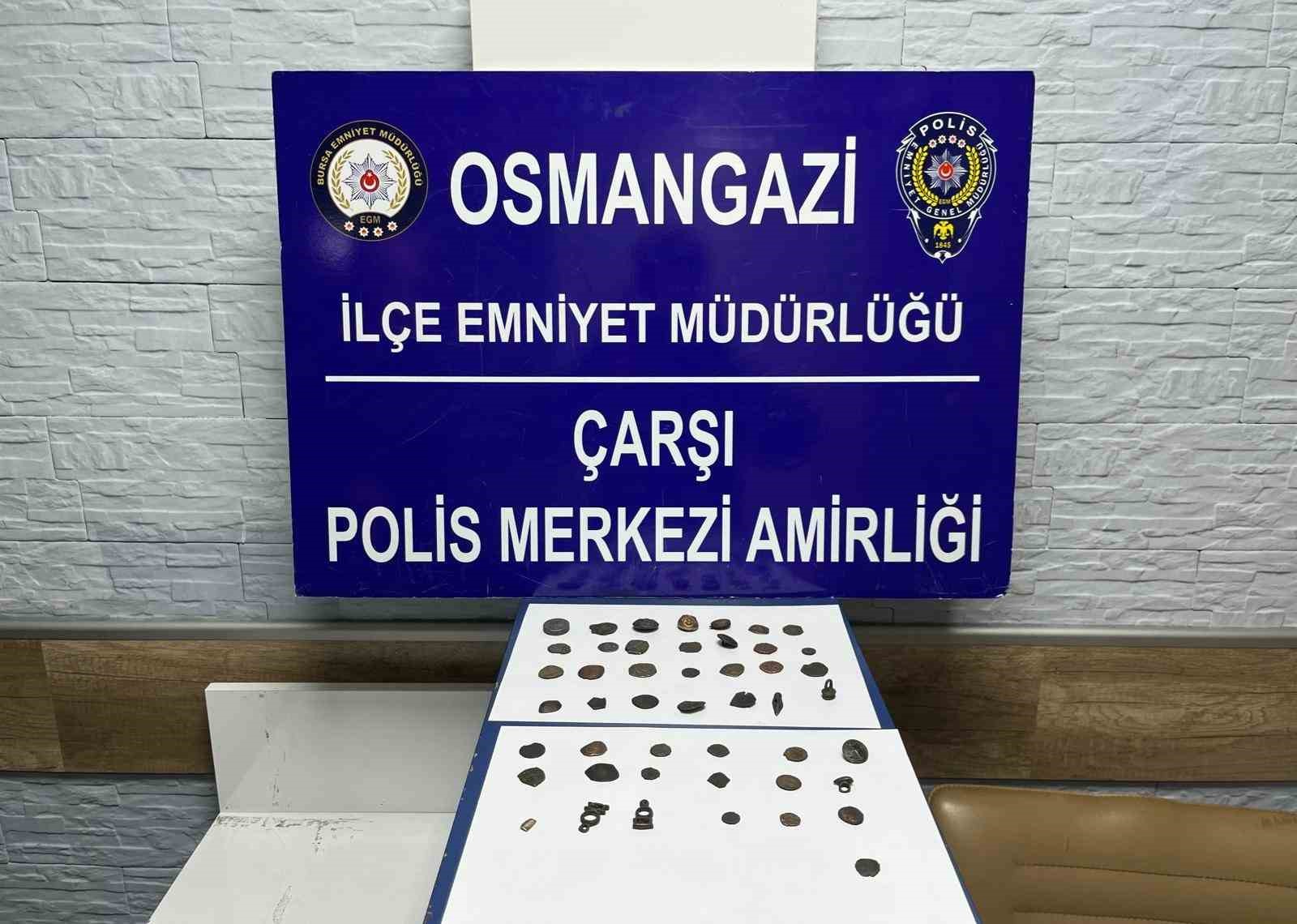 Bursa’da devriye atan gece bekçilerini görünce kaçmaya başlayan şüpheli, kovalamaca sonucu yakalandı. Üzerinde 47 adet tarihi eser ve sikke olduğu değerlendirilen parça ele geçirilen şüpheli, çıkarıldığı mahkemece tutuklanarak cezaevine gönderildi.