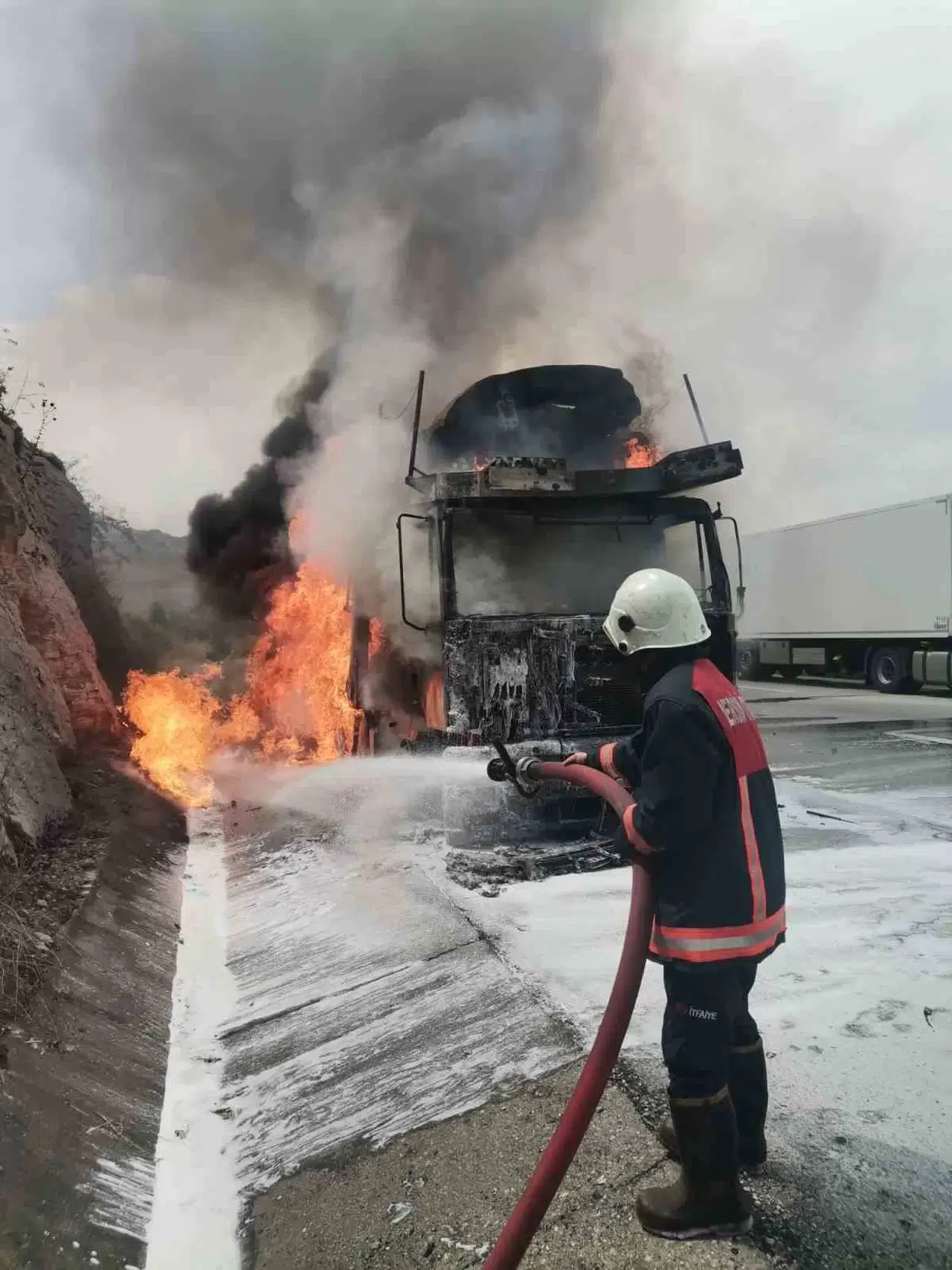 Durumu fark eden sürücü Ö.G., aracı güvenlik şeridinde durdurdu. Rüzgarın da etkisiyle alevler bir anda aracın her tarafını sardı. Mersin Büyükşehir Belediyesi itfaiye ekiplerinin müdahalesi ile alevler söndürülürken, tır ile birlikte yük olarak taşınan 7 araç küle döndü. Bir araç ise son anda kurtarıldı.