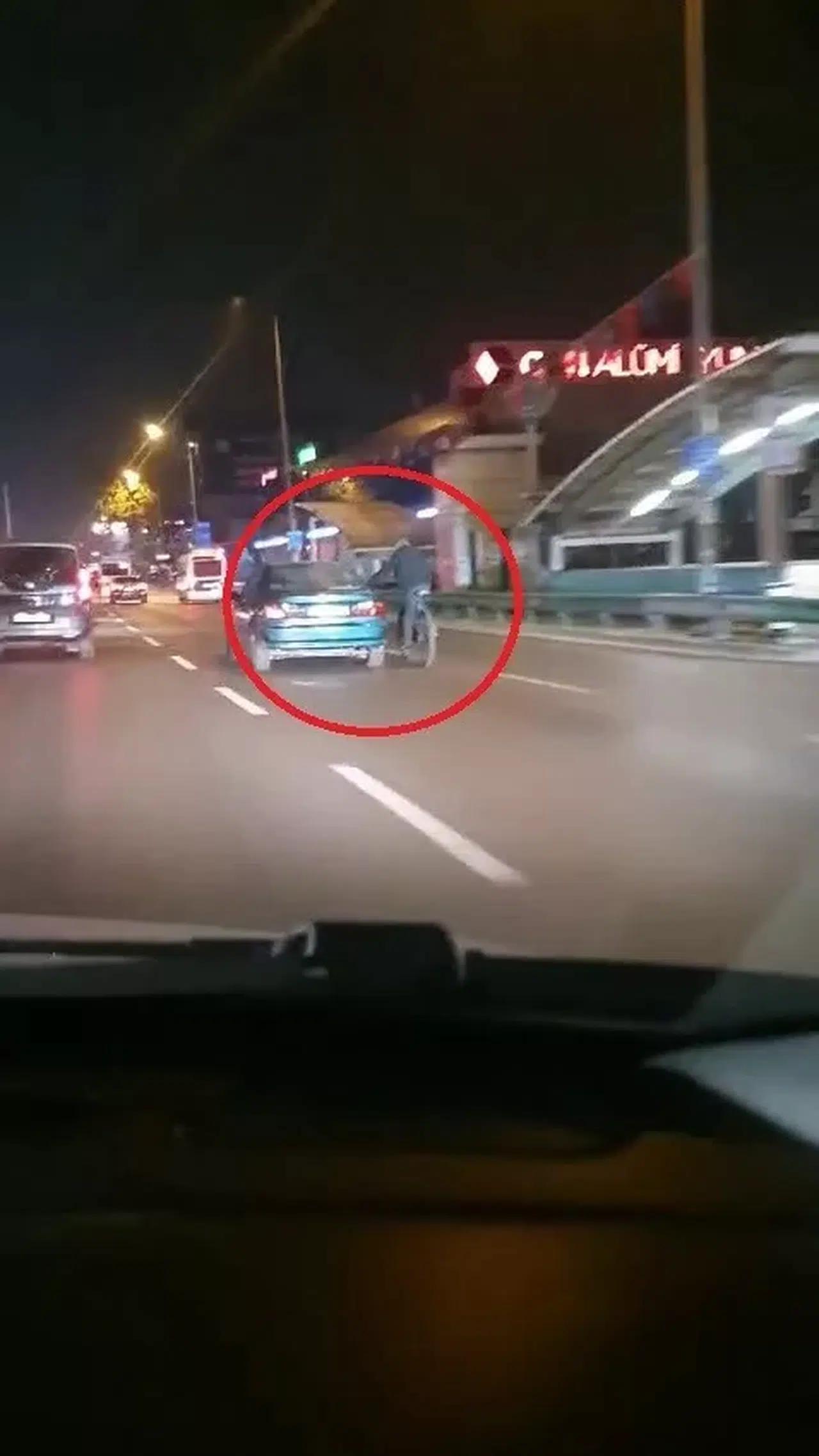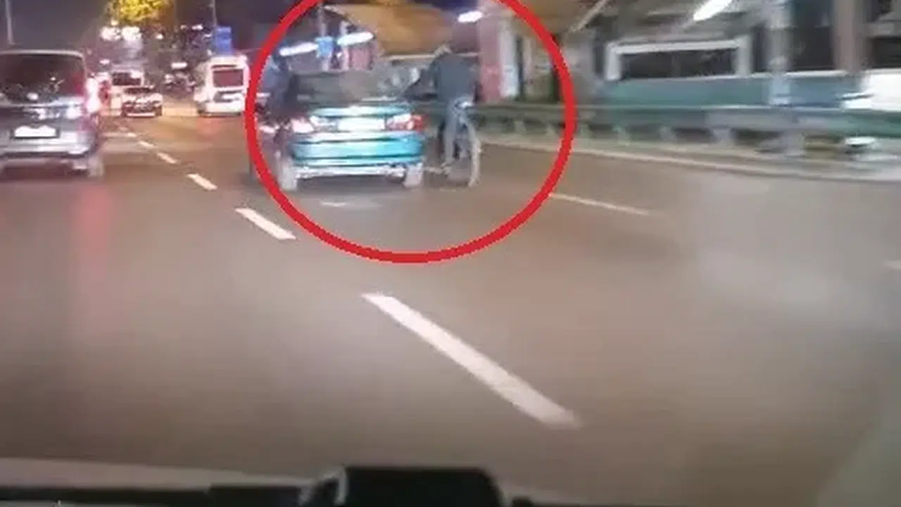 Bursa’da seyir halindeki otomobile tutunarak ilerleyen bisiklet sürücüsü kendisini tehlikeye attı. O anlar saniye saniye kaydedildi.