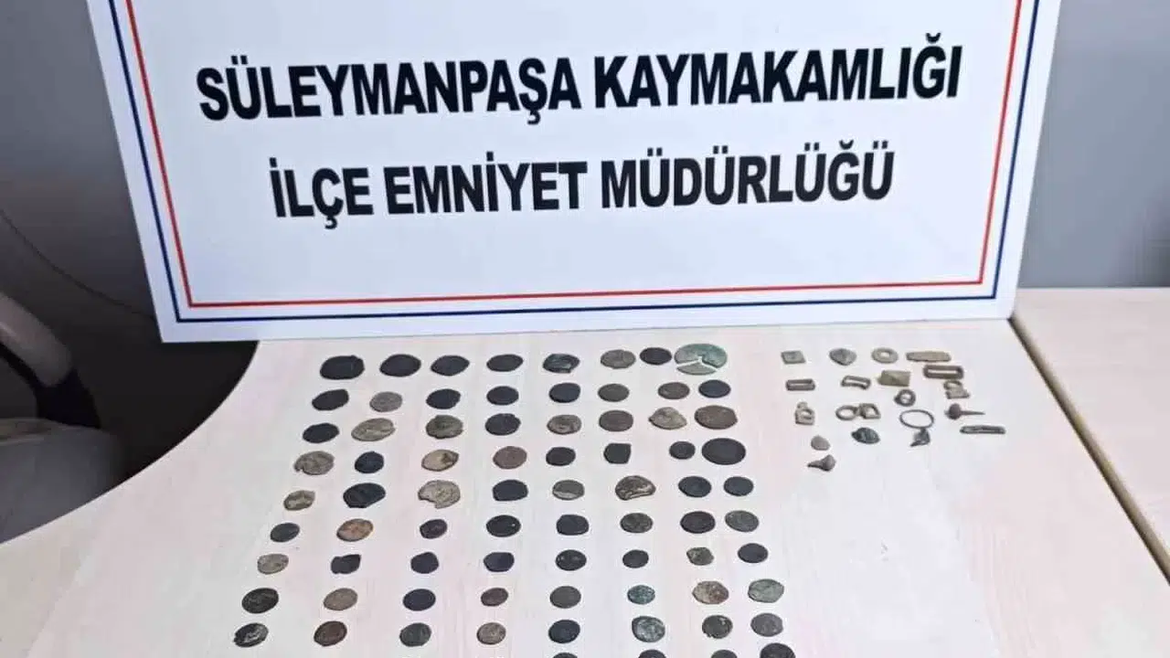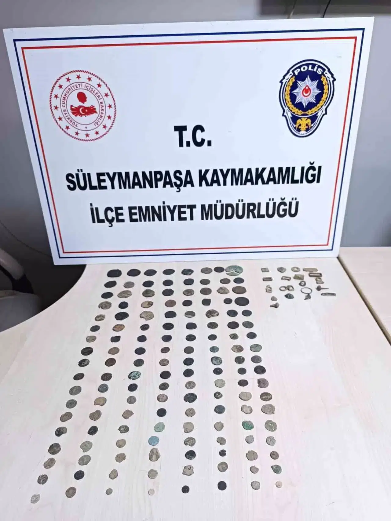 Tekirdağ Süleymanpaşa’da polis ekiplerinin Yavuz Mahallesi’nde gerçekleştirdiği operasyonda, 145 sikke ve 9 parça tarihi eser ele geçirildi.