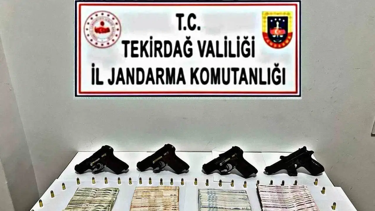 Çerkezköy Gültepe Mahallesinde E.A. isimli şahsın ikametinde yapılan aramada 3 adet 7.65 mm çapında ruhsatsız tabanca, 1 adet 9 mm çapında ruhsatsız tabanca, 4 adet tabanca şarjör, 29 adet 7.65 mm çapında tabanca fişeği, 34 bin 850 TL suçtan elde edilen para, 1 adet Cep telefonu ele geçirildi.