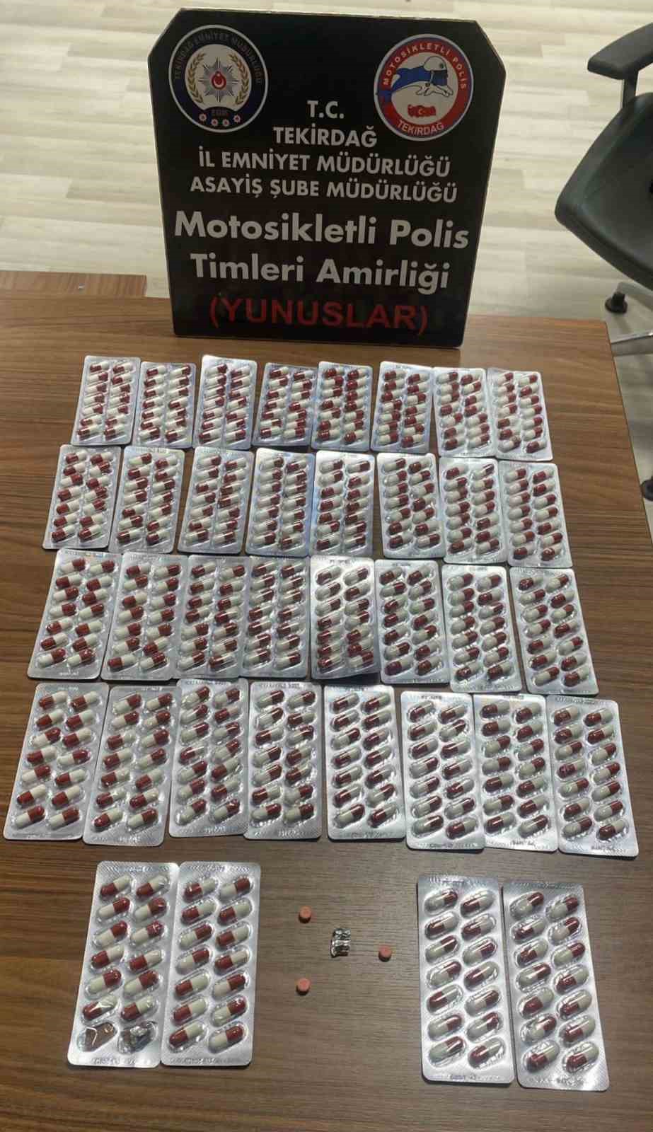 Tekirdağ İl Emniyet Müdürlüğü Asayiş Şube Müdürlüğü Motosikletli Polis Timleri Büro Amirliği görevlilerince Süleymanpaşa ilçesinde yapılan denetimlerde çeşitli suçlardan çok sayıda suç kaydı bulunan N.A., G.G. ve H.A. isimli şahısların üst ve eşyaları üzerinde yapılan aramalarda, 36 tablet halinde toplamda 502 adet sentetik ecza, 3 adet ecstasy uyuşturucu maddesi ve 1 adet kullanıma hazır metamfetamin uyuşturucu maddesi ele geçirildi.