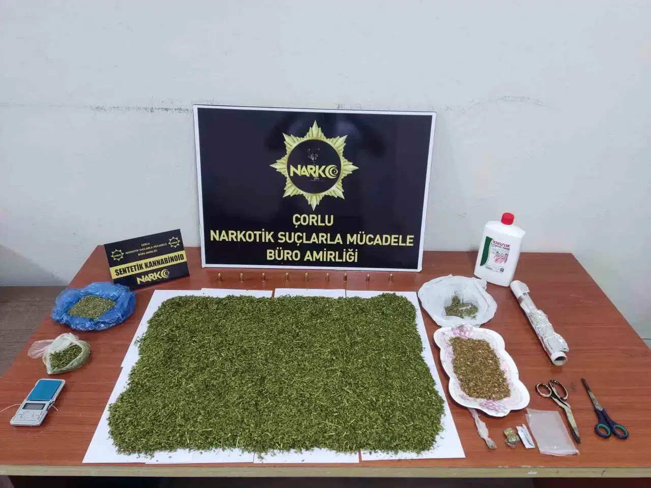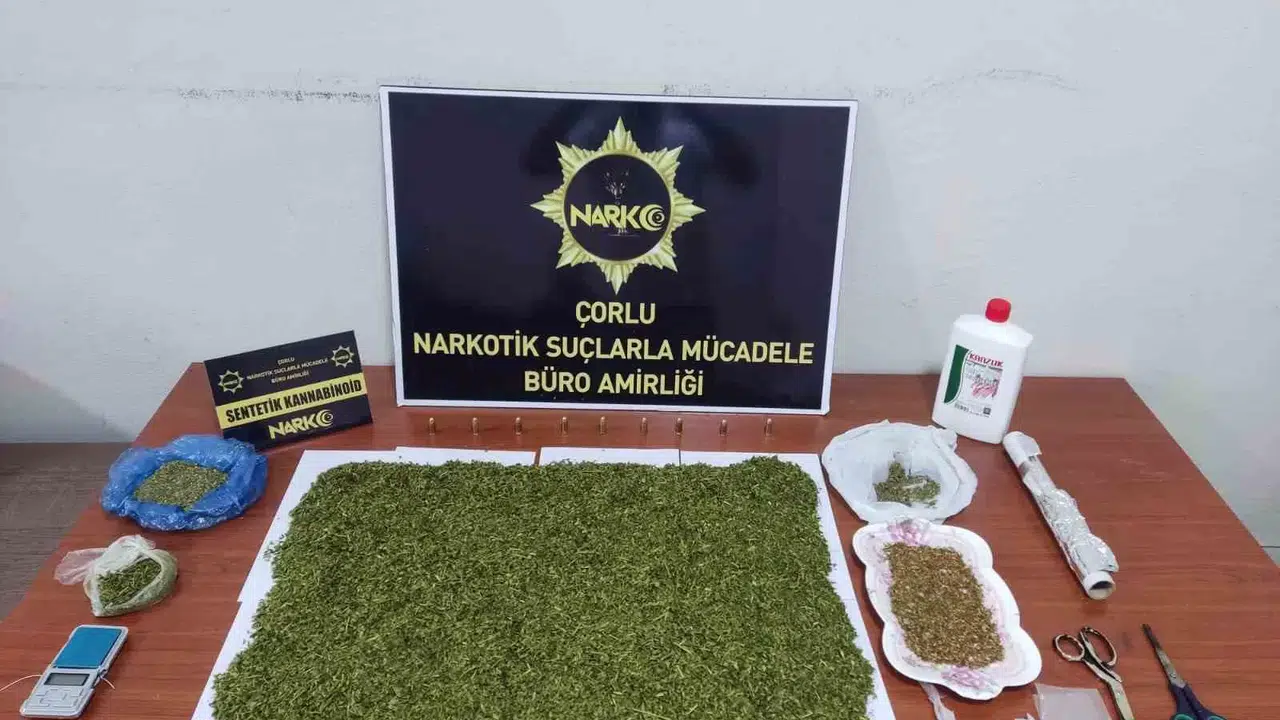 Tekirdağ İl Emniyet Müdürlüğü Narkotik Suçlarla Mücadele Şubesi ekiplerince Çorlu ve Ergene ilçelerinde 1 ikamet ve 1 işyeri adresine yönelik operasyon düzenlendi. Operasyonda yapılan aramalarda 578 gram sentetik kannobinoid maddesi, 1 adet hassas terazi, 9 adet 9x19 tabanca fişeği ele geçirildi.