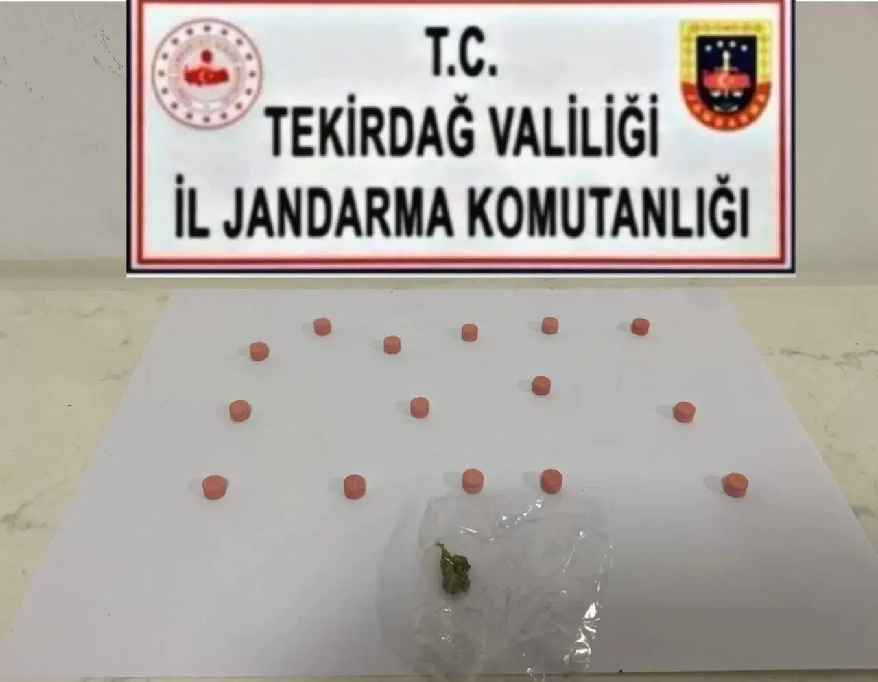 Tekirdağ İl Jandarma Komutanlığı unsurlarınca Çerkezköy Atatürk Mahallesi’nde icra edilen önleyici kolluk devriyesi de, M.S. isimli şahsın yapılan üst aramasında 15 adet sentetik uyuşturucu hap ve 0,5 gram esrar maddesi ele geçirildi.