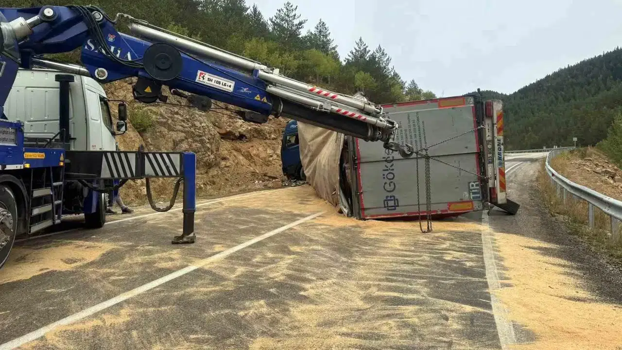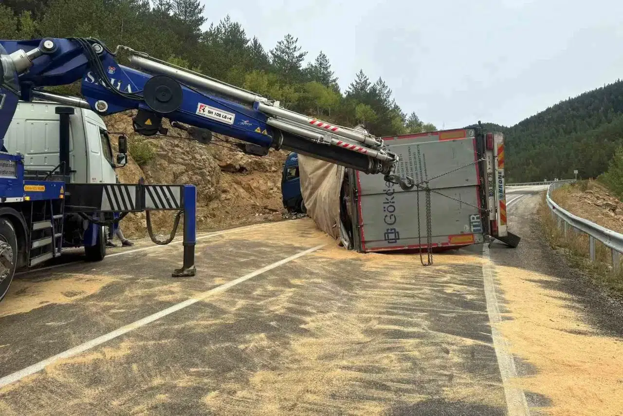 Karayolunda ulaşım bir süre kapanırken, ekiplerin yolda temizlik yapıp tırı çekmesinin ardından trafik akışı kontrollü olarak sağlanmaya başladı.
