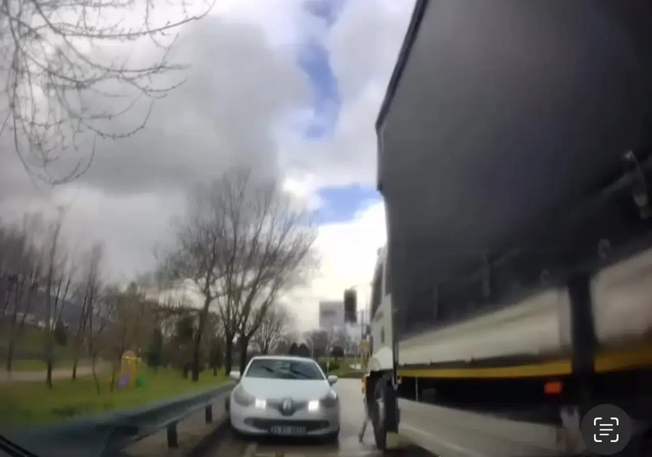 Bursa’da seyir halindeki otomobil şerit değiştirince tırın çarpmasıyla bariyerlere savruldu, kaza anı kameraya yansıdı.