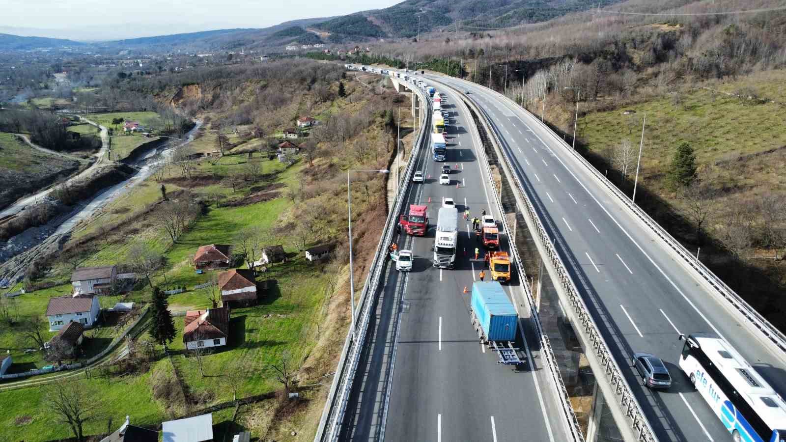 Düzce’de meydana gelen trafik kazasında tırın dorsesi yerinden koptu. Kaza sebebi ile yolda uzun araç kuyrukları oluştu.