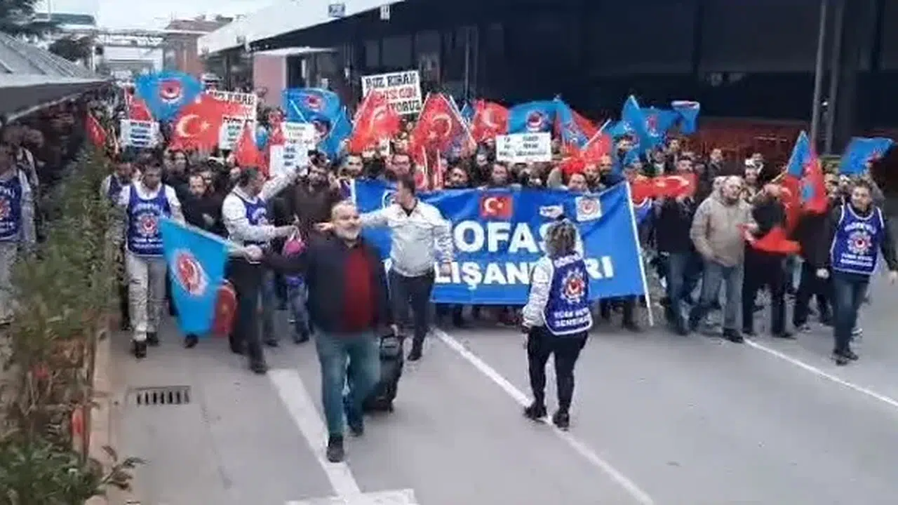 Türkiye’nin otomotiv devi Tofaş Otomobil Fabrikasında toplu iş sözleşmesindeki zam oranını beğenmeyen işçilerin eylemleri sürüyor. Fabrika yemekhanesindeki çatal bıçaklı protestonun ardından bugün de işçiler fabrika bahçesinde pankart açıp gösteri yürüyüşü yaptı. Bosch Fabrikası’nın yanısıra onlarca otomotiv ve yan sanayi fabrikasında sendika üyesi işçilerin eylemleri sürüyor.